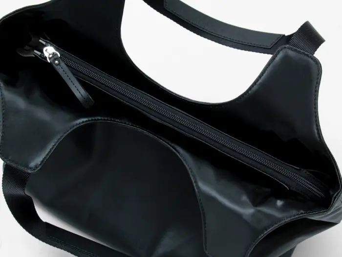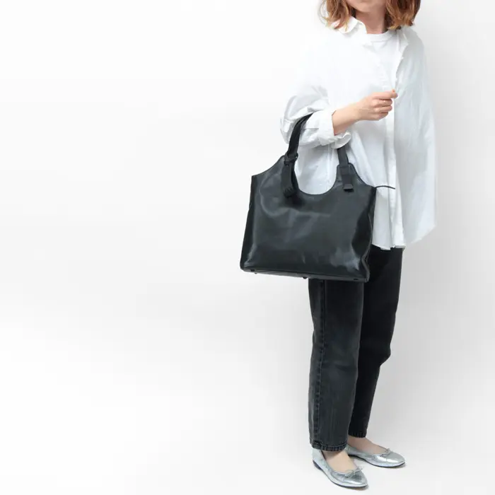 本体はくり手デザインなのでゆったり肩掛けが可能です。太めのテープハンドルの持ち手部分にはレザーが巻いてあり、手にフィットし持ちやすく、肩に掛けても革の厚みにより肩に掛けても痛くなりにくい仕様です。