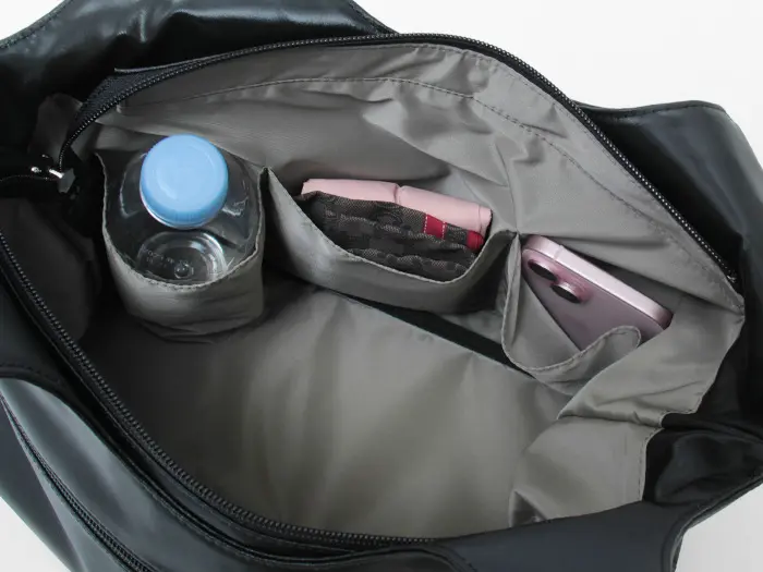 A4サイズのノートが収納可能。正面内側にオープンポケット2つ、内側にはボトルホルダー1つが備わっており、転がって収納しにくい小物を綺麗に持ち運べます。