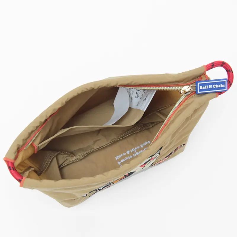 マルチに活躍してくれるBall&Chain/ボールアンドチェーンのポーチ。少し大きめサイズなのでメイクポーチやバッグインバッグなど様々な用途でお使いいただけます。アーティストとのコラボによる刺繍が素敵なデザインです。