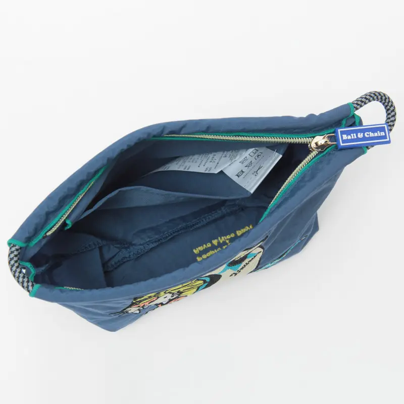 マルチに活躍してくれるBall&Chain/ボールアンドチェーンのポーチ。少し大きめサイズなのでメイクポーチやバッグインバッグなど様々な用途でお使いいただけます。アーティストとのコラボによる刺繍が素敵なデザインです。
