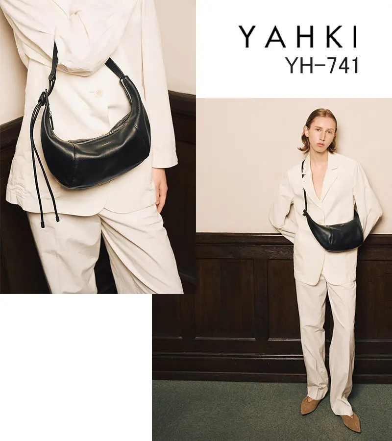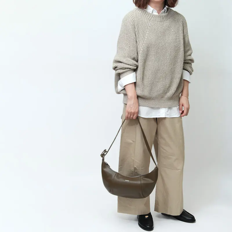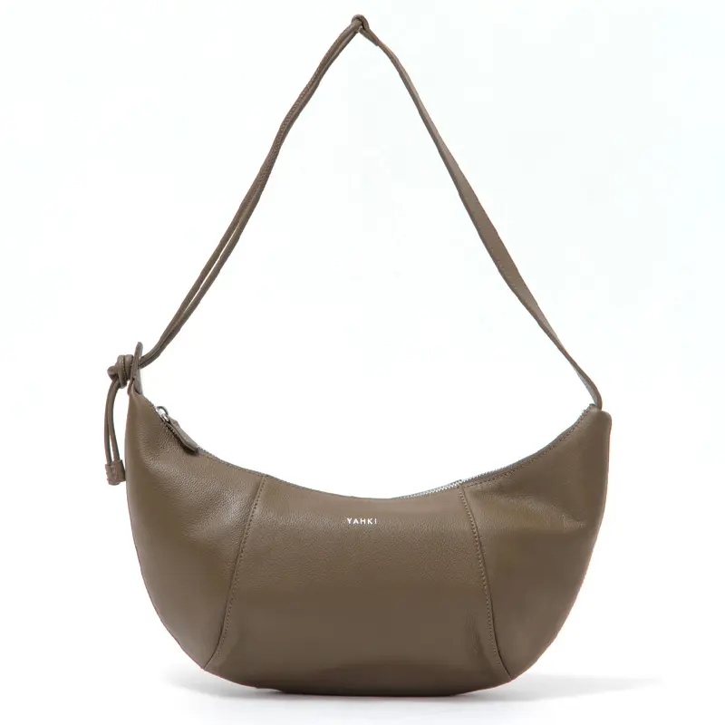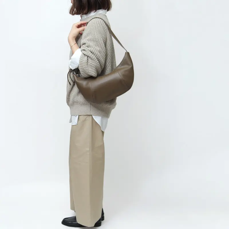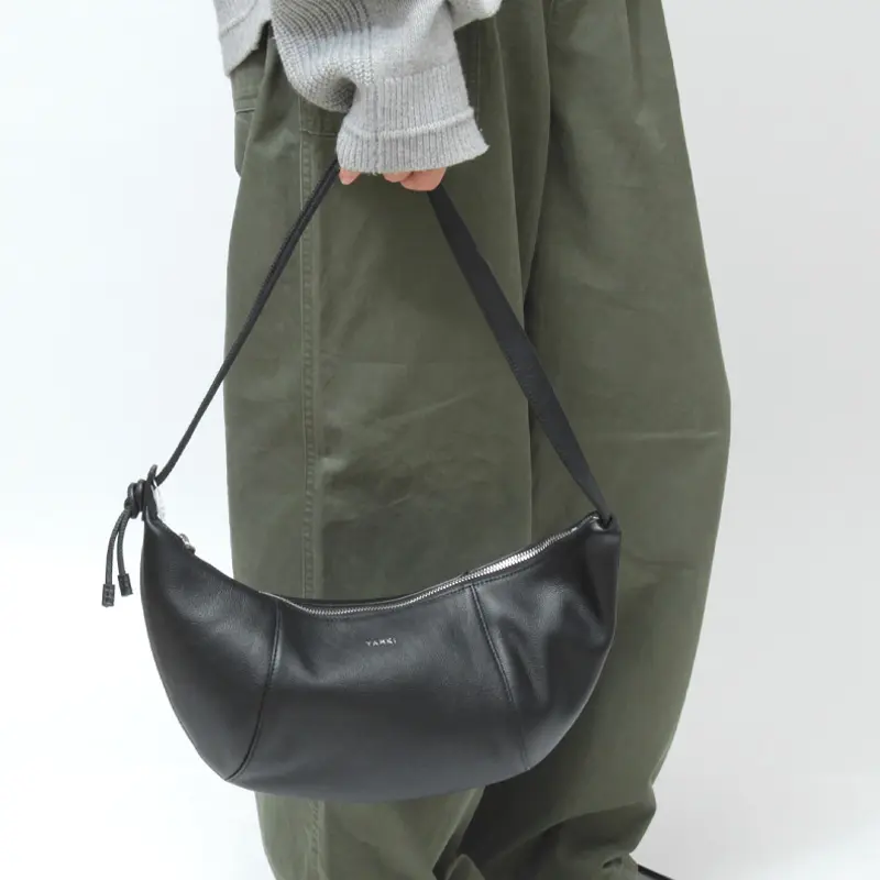 クロワッサンのような三日月の形をした優美なカーブが魅力の"YAHKI/ヤーキ"のショルダーバッグ。のショルダーバッグ。マチのある立体構造で見た目以上の収納力を備え、長財布や500mlボトルなどもすっきりと収まります。やわらかなレザーが身体に自然にフィットし、洗練されたステッチワークがスタイリッシュな印象を演出。日常使いはもちろん、装いのアクセントとしても活躍するひと品です。