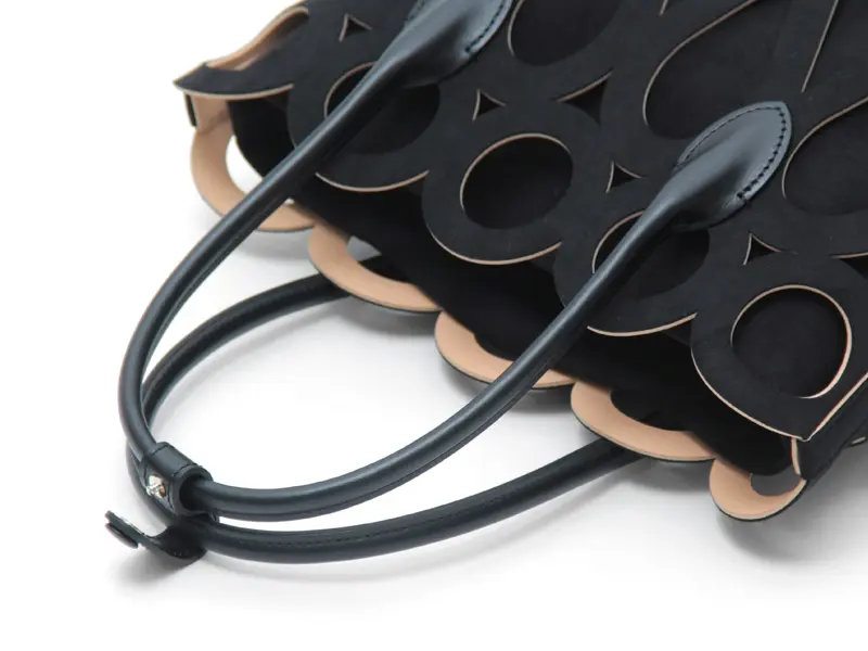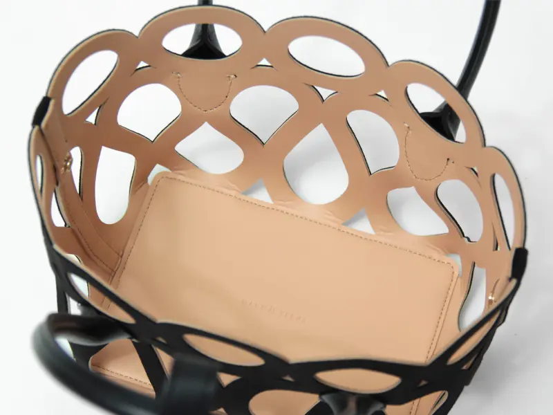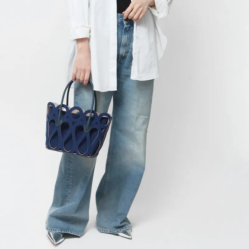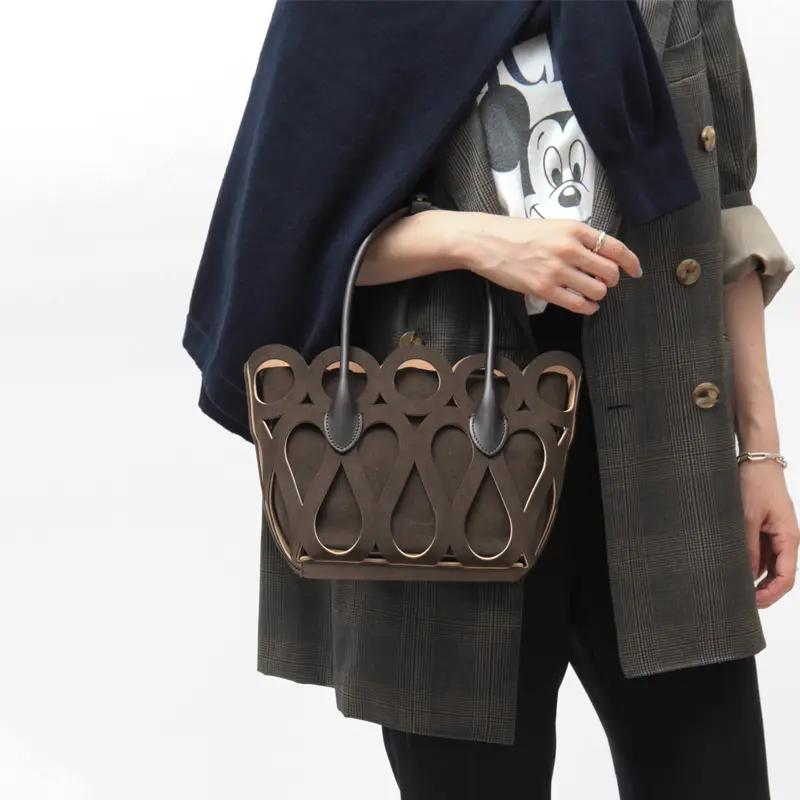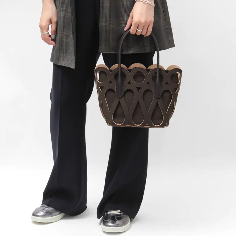 アートのようなカットワークが目を引く。少し細めのハンドルはで女性らしさをプラスし、手持ちでも肘に掛けても使いやすい絶妙な長さ。存在感のあるデザインが、いつもの装いに華やかなアクセントを添えてくれます。