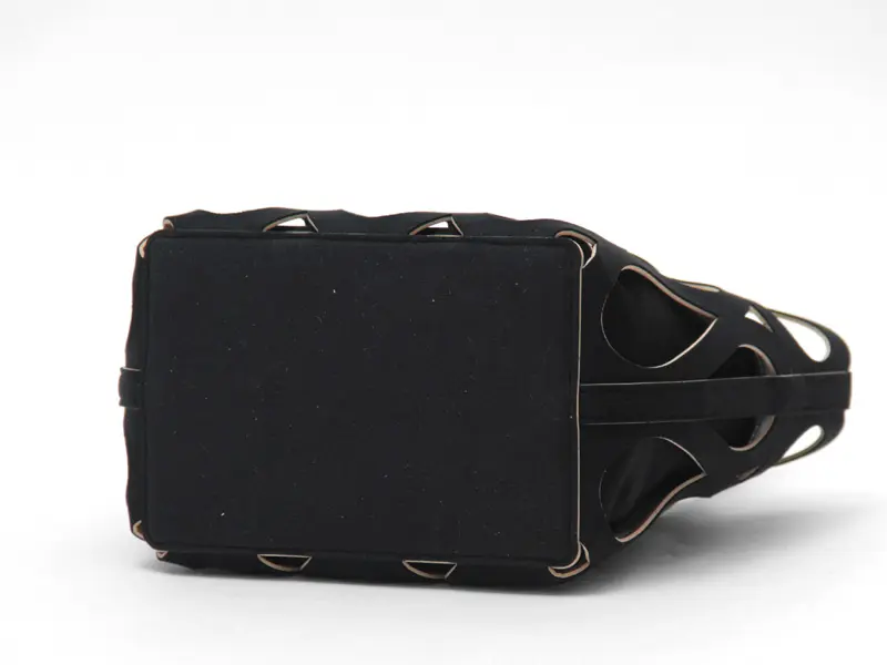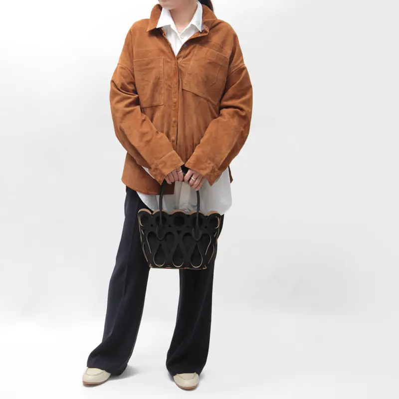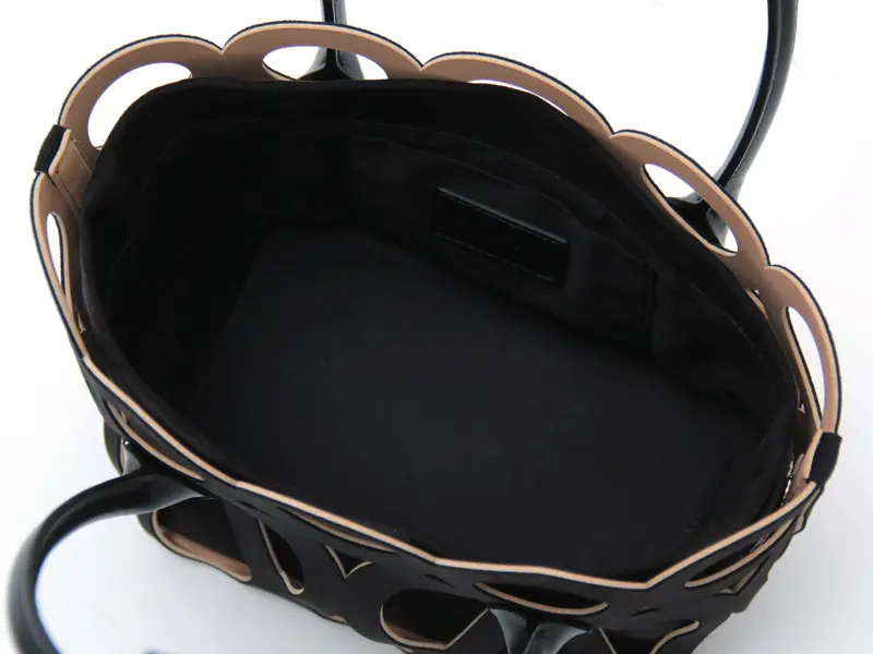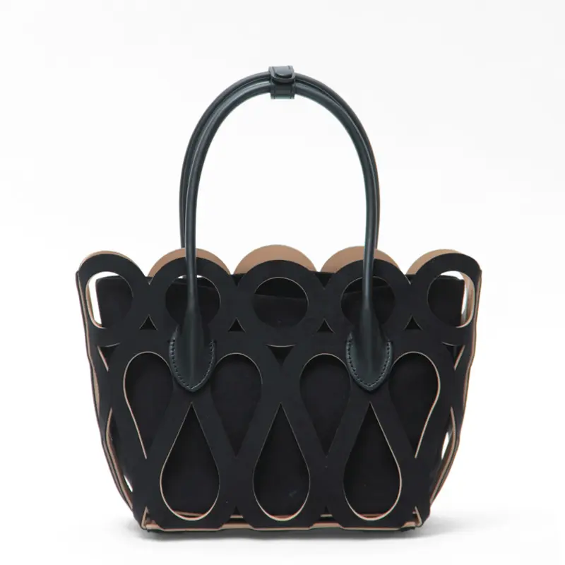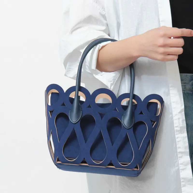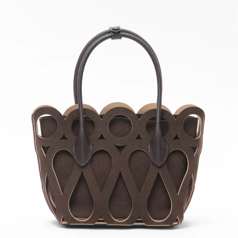 アートのようなカットワークが目を引く。少し細めのハンドルはで女性らしさをプラスし、手持ちでも肘に掛けても使いやすい絶妙な長さ。存在感のあるデザインが、いつもの装いに華やかなアクセントを添えてくれます。