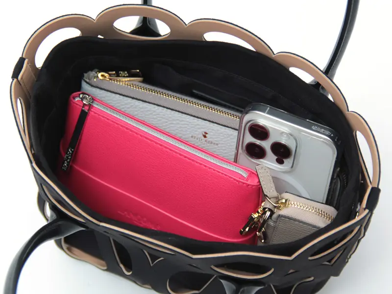 インナーポーチの開閉はマグネット仕様。荷物がスムーズに取り出せます。長財布やポーチなどの必需品がきれいに収まるサイズ感。内ポケットが1つ配置されており、さっと取り出したい定期やスマホの収納に便利です。