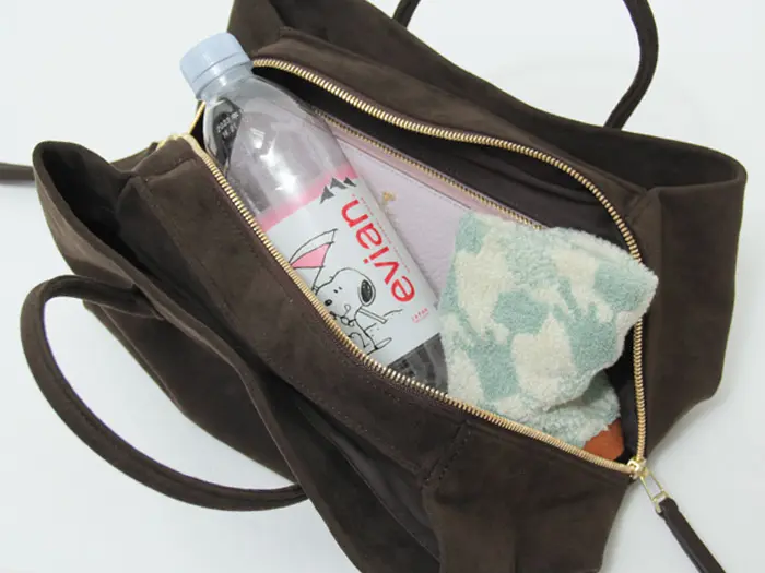長財布やポーチなど必需品が収まり500mlのペットボトルも横向きに収納でき、お出かけにちょうどいい収納量です。背面の内側には大きめのファスナーポケットが1つ付いており、貴重品などの収納に便利です。