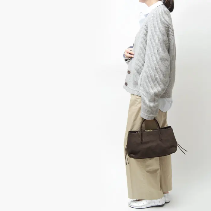 レディライクな印象の細めなトップハンドルは、すこし長めの長さで、腕に掛けるスタイルも可能です。