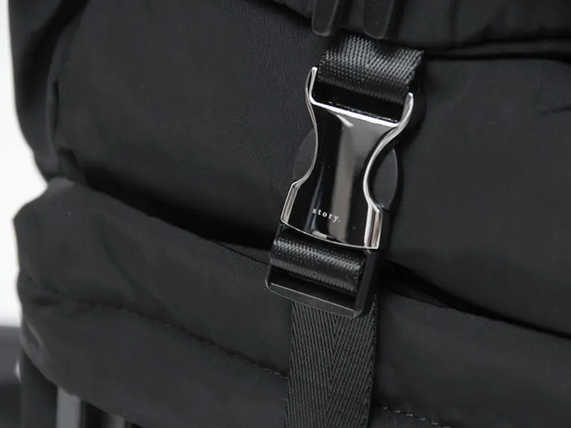 シルバーのバックルベルトがアクセントになった、"story./ストーリ"のリュックサック。メインを開けずに取り出せる便利なポケットを多数配置し、A4や13インチPCも収納可能。軽量で耐久性にも優れ、ビジネスからカジュアルまで幅広く使えるユニセックスデザインです。