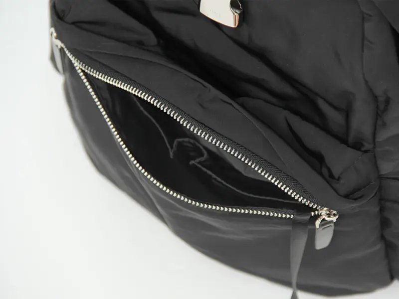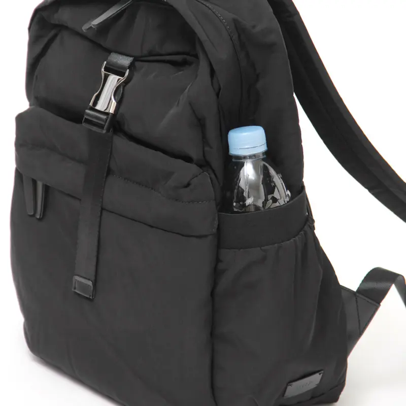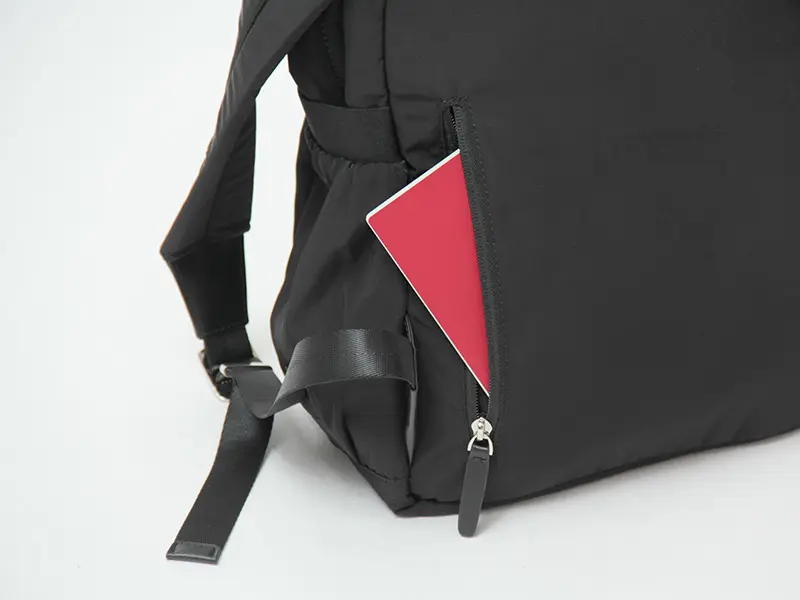 外側両サイドには携帯やペットボトルや折り畳み傘など、頻繁に出し入れするアイテムを収納しやすいゴム付きポケットを配置。背面に小物収納に便利なファスナーポケットあり、さっと取り出したいパスポートやパスケースなどの貴重品をしまっておくとセキュリティ面でも安心です。