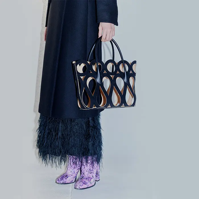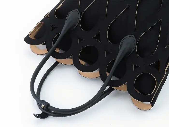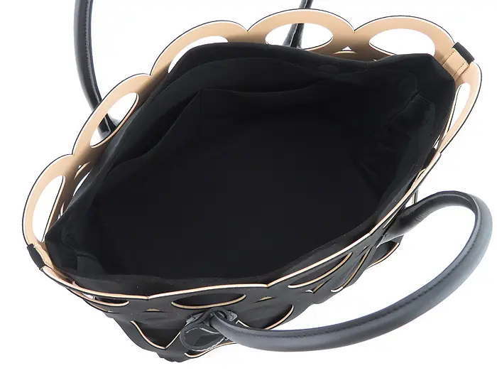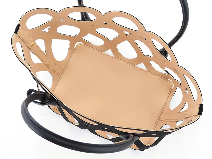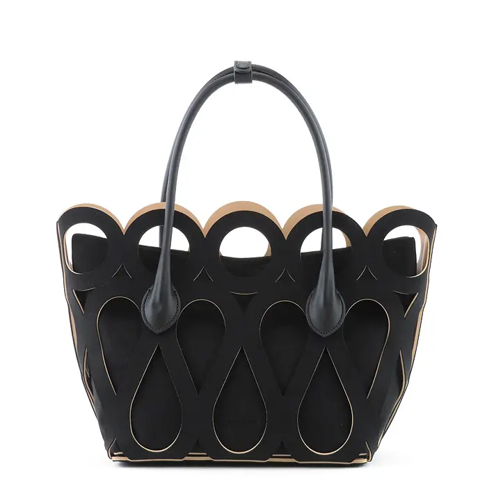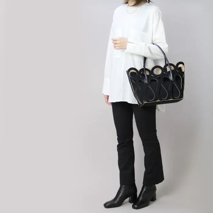 カットワークこそ個性的ですが、フォルムはいたってシンプルなトート型。素材が引き立ち、腕に掛けても手提げで持ってもこなれ見えします。インナーバッグを外せば、より軽やかな印象。お手持ちのインナーバッグやスカーフなどと合わせても素敵です。