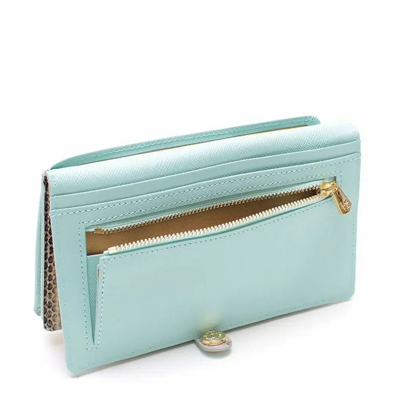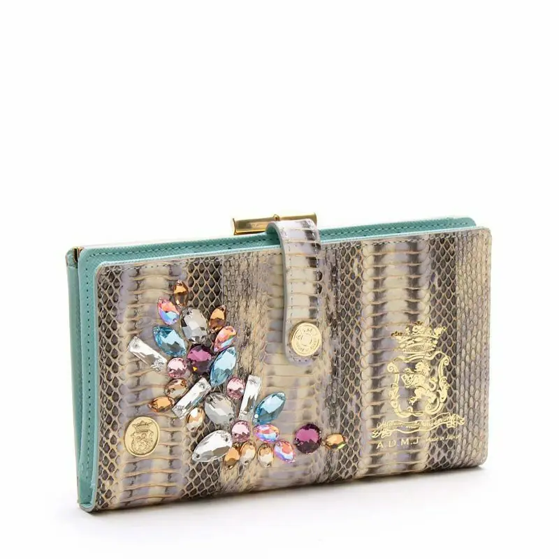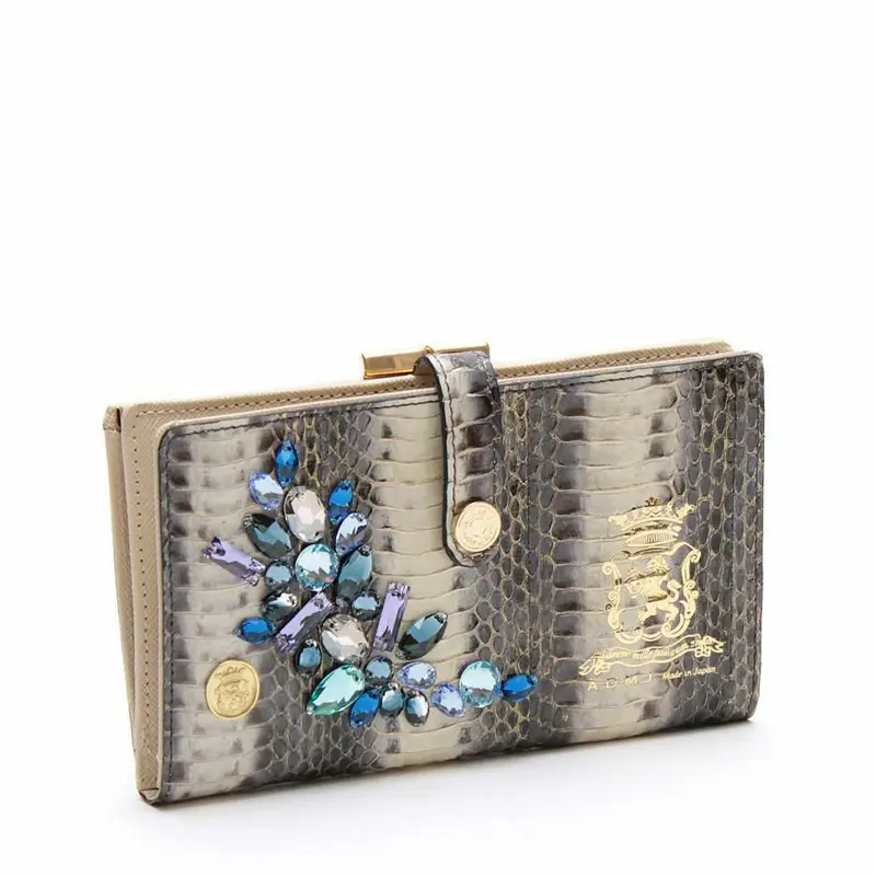気品漂うスネークレザーに19石のクリスタルをあしらった、"ADMJ エーディーエムジェイ"のロングウォレット。