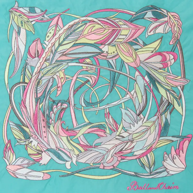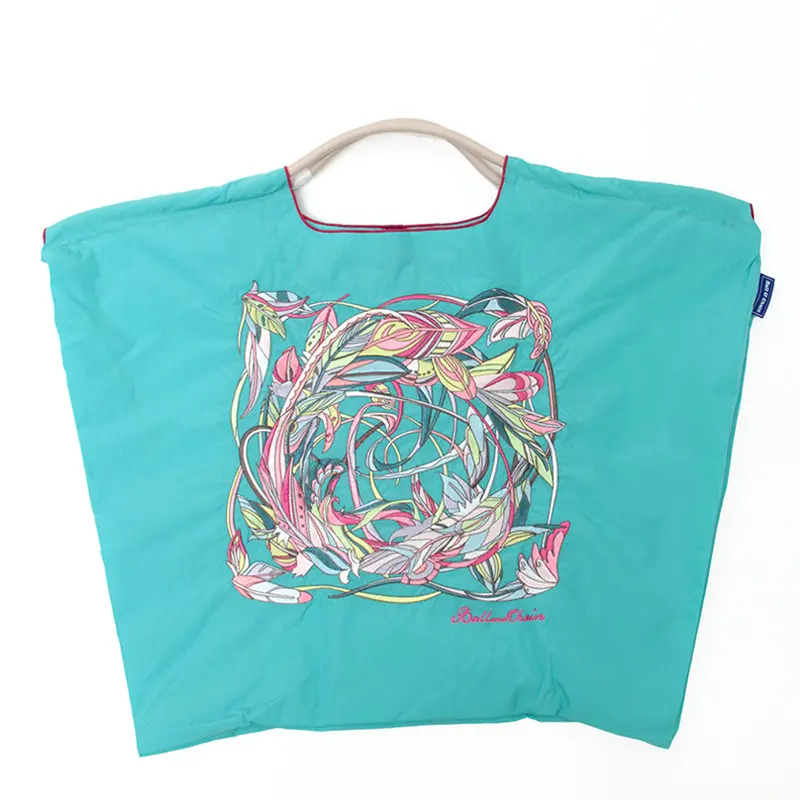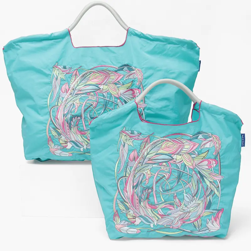 爽やかなブルーのナイロンバッグに、彩り豊かな羽が軽やかな透明感を添えています。繊細なフェザーモチーフと、しなやかなフォルムが美しく調和され、カラフルでありながら上品な印象のエコバッグに仕上がっています。