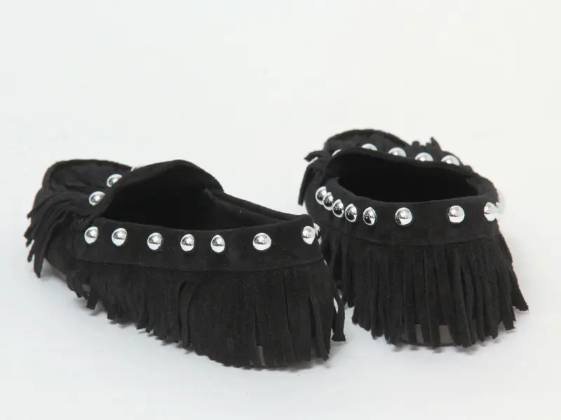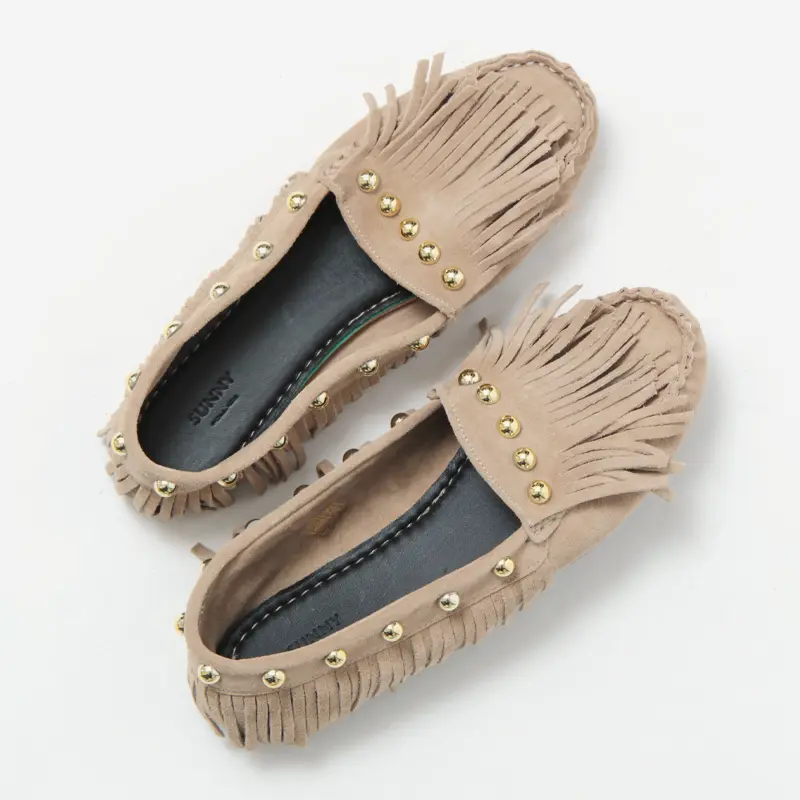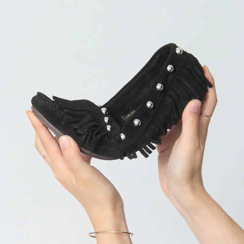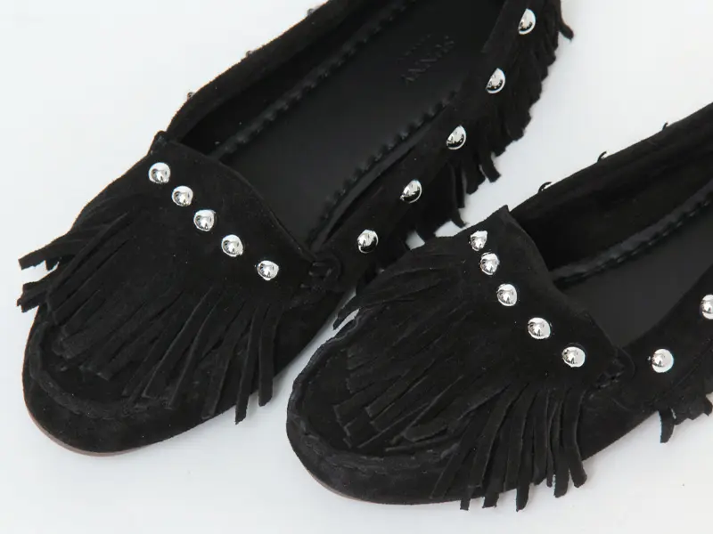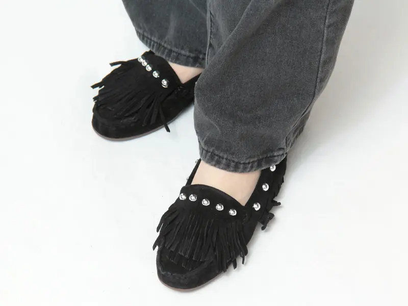 シューズ全体を包み込むようなフリンジデザインが印象的なモカシン。ギリギリまで長く設計されたフリンジは、歩くたびに軽やかに揺れ、足元に表情を添えます。大粒のスタッズを散りばめたことで、可愛らしさの中にキリっとしたエッジをプラス。大人のカジュアルスタイルに華やぎを与えてくれるデザインです。