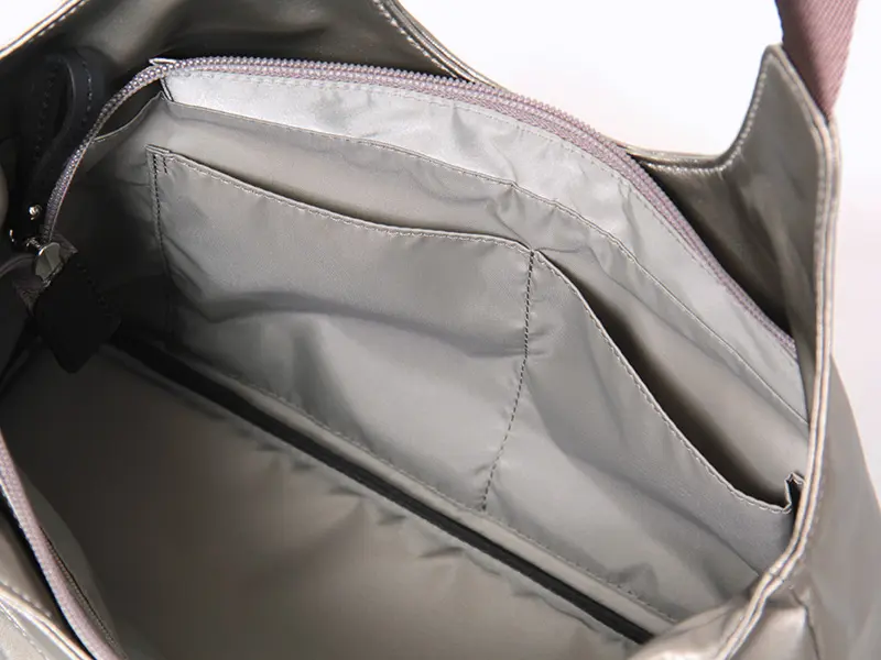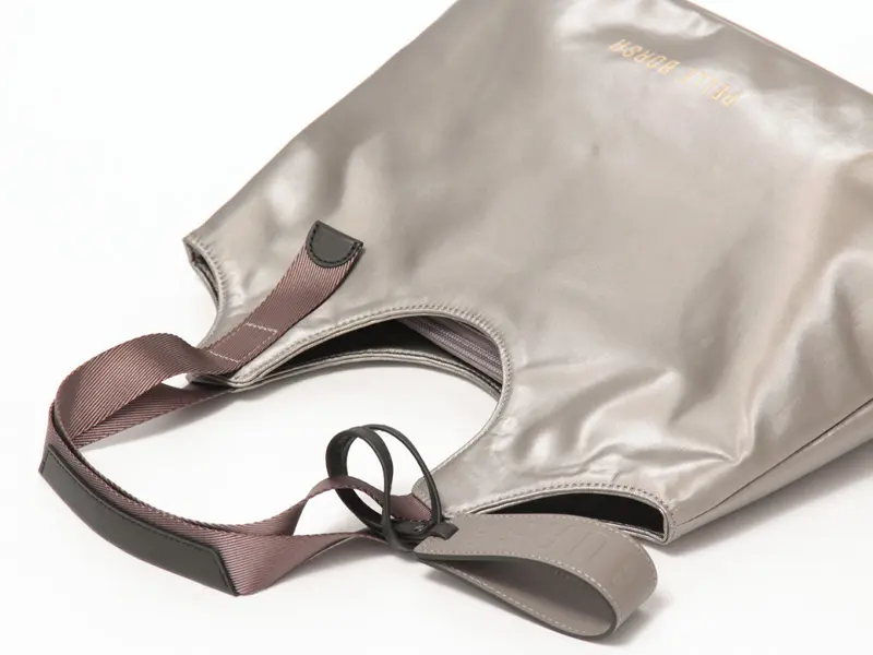 本体生地は、ソフトでボリュームのある基布とポリウレタンの2層構造。優れた強度としなやかさを兼ね備えています。表面には繊細な絹目調のシボ加工を施し、セミマットな上品さと光沢感を表現。水にも強く、日常使いに適した扱いやすい素材です。