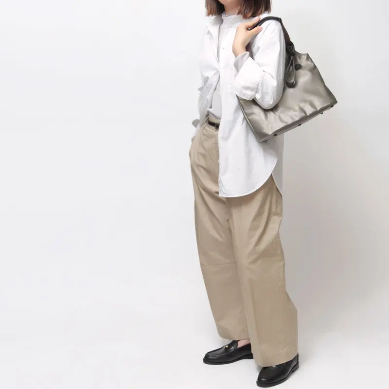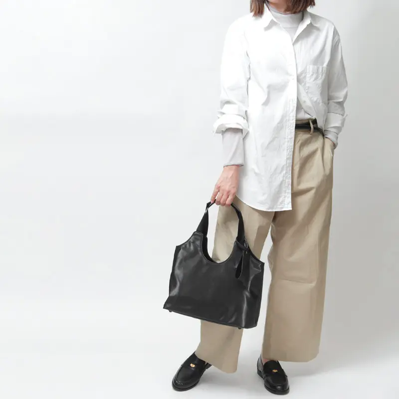 セミマットなシボ感が上品な印象を演出するB5トート。軽くて使いやすく、街歩きにもお仕事バッグにもなじむ、上質感とミニマルさが魅力です。毎日のお出かけやTPOを気にする日にも、品よく寄り添ってくれる頼れる存在です。