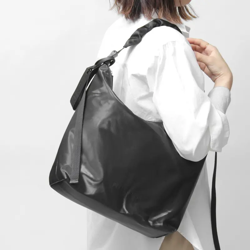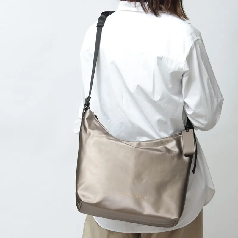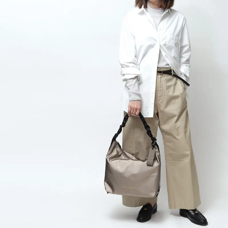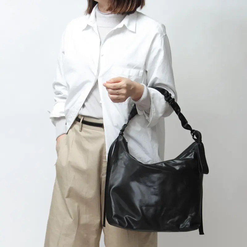 クシュクシュとしたハンドルが可愛いホーボーバッグ。調節することで斜めがけできる長さになるのでクロスボディにしたりと、スタイルに合わせて使い分けられます。軽くて使いやすく、街歩きにもお仕事バッグにもなじむ、上質感とミニマルさが魅力。毎日のお出かけに、品よく寄り添ってくれる頼れる存在です。