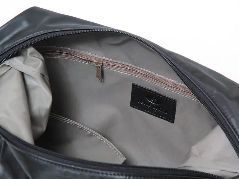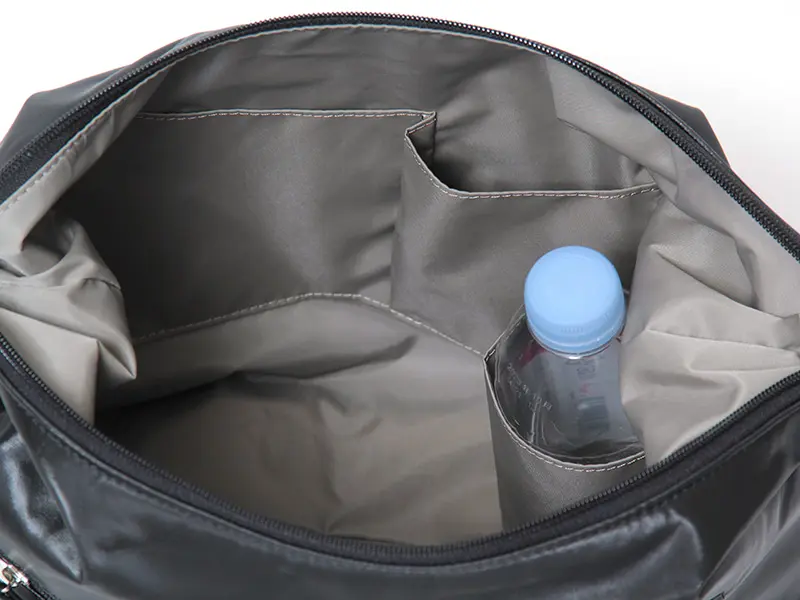 長財布が入る大き目なファスナーポケットが1つ、さらにオープンポケットが2つとボトルホルダーを備え、仕分け収納で整理された状態を保ちやすい設計です。