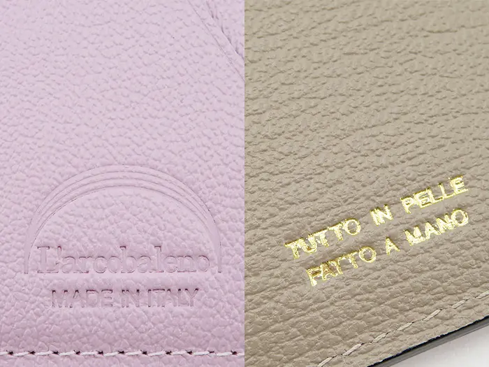 フランスの高級老舗タンナーアルラン社の美しい発色と細やかな型押しの山羊革を使用しています。繊維が細かく、軽くて、耐久性に優れた、傷のつきにくい素材で、仕立ても良く、長くご愛用いただけます。レザーには素押しのラルコバレーノの刻印と、オールレザー・オールハンドメイドの証、"TUTTO IN PELLE FATTO A MANO"が刻まれています。