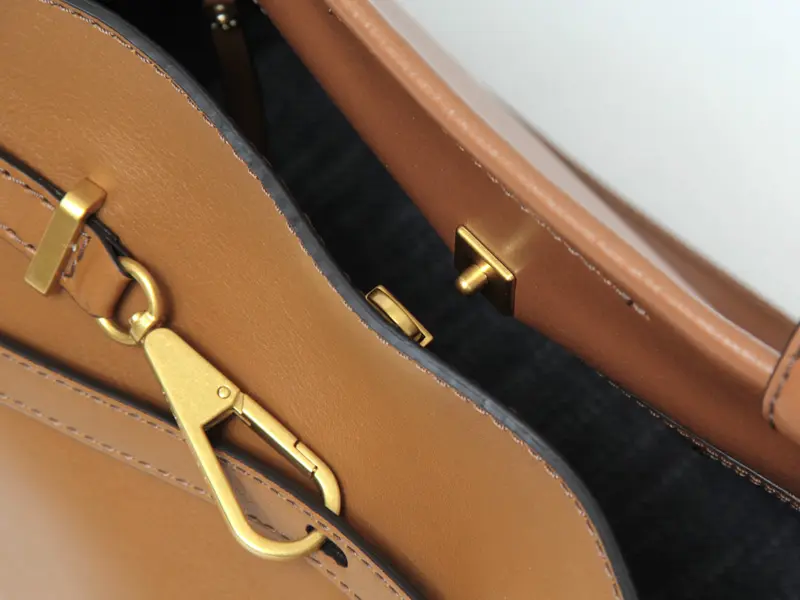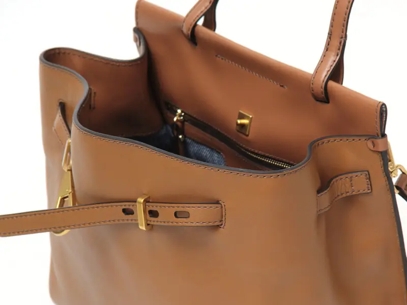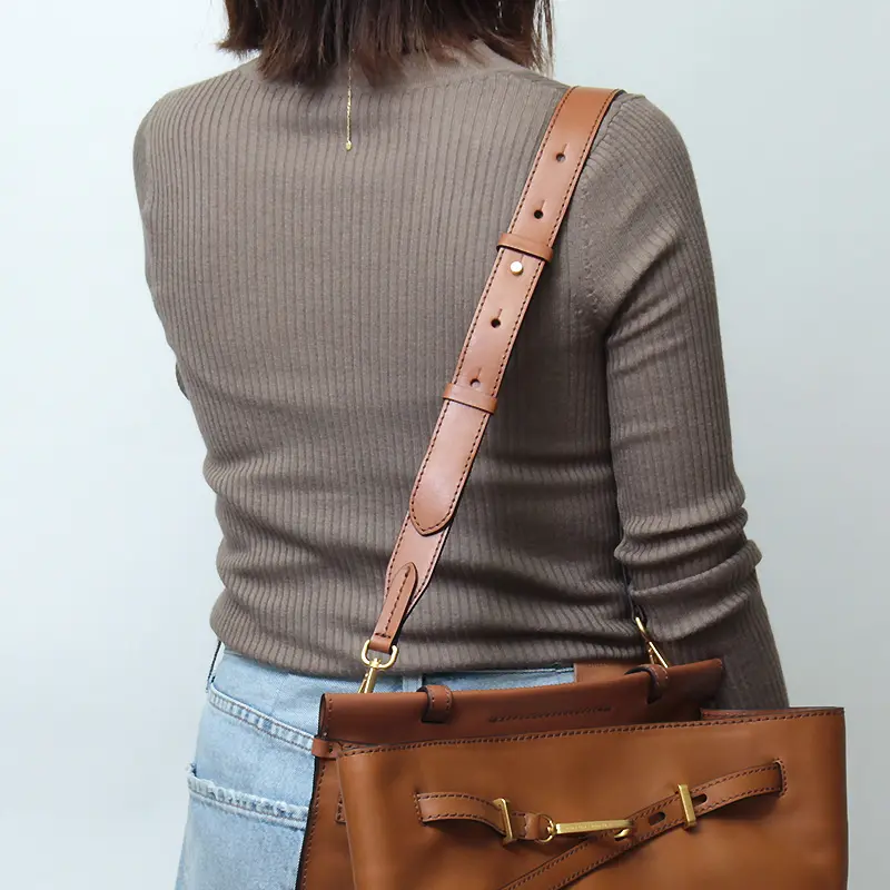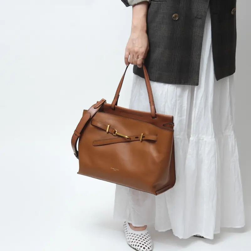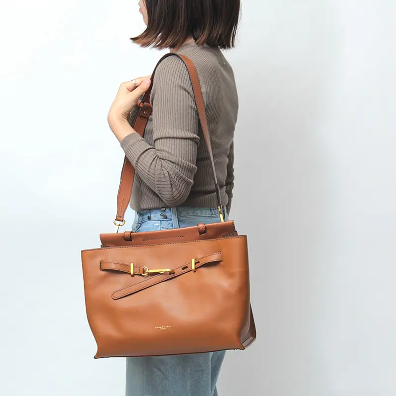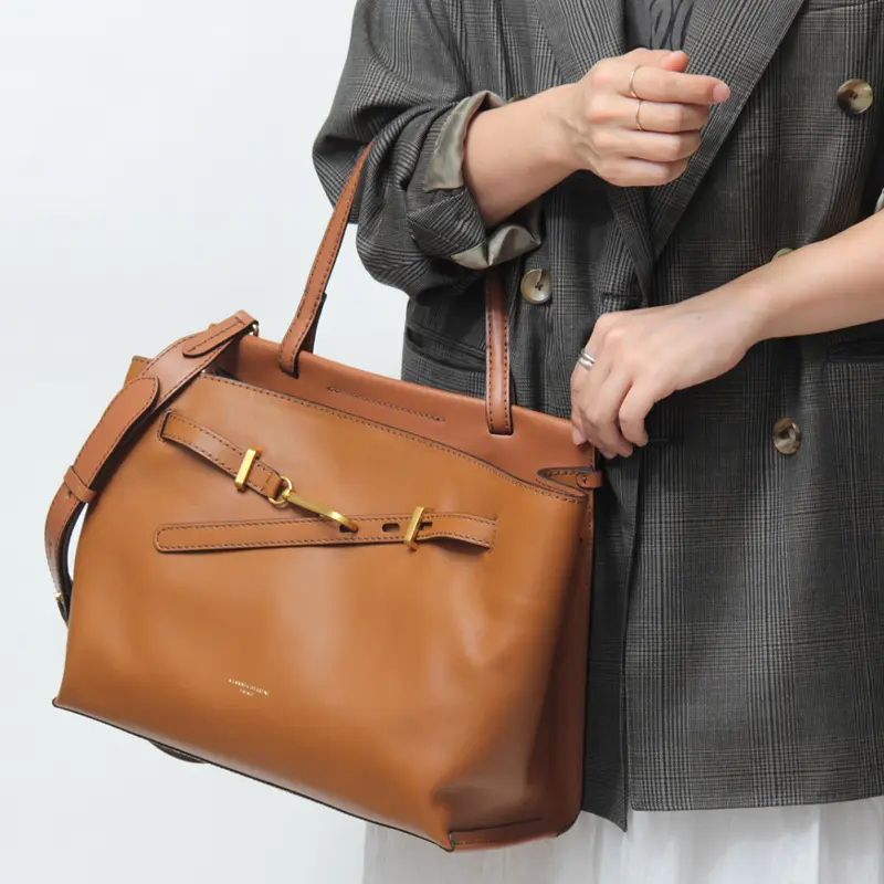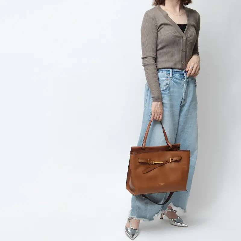 レザーのワンハンドルは、きちんと感があり通勤やフォーマルなシーンにもなじみます。手持ちはもちろん手首に通してもバランスよく収まる程よい長さで、快適に使える設計。バッグをさっと置いて開け閉めできるため、荷物の出し入れもスムーズです。