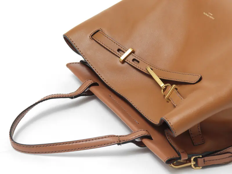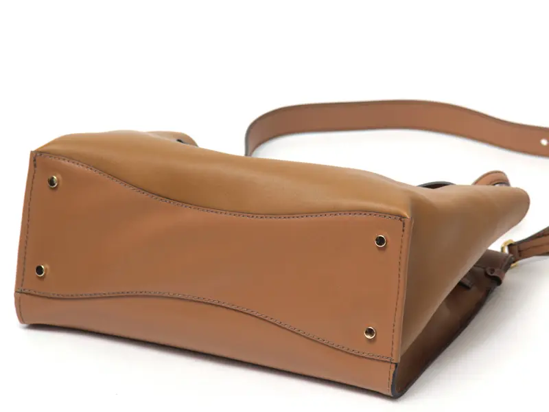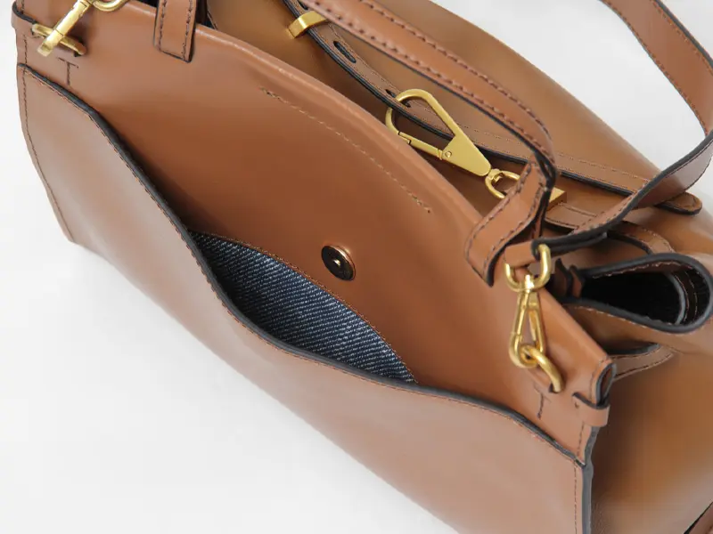 柔らかくしっとりとした肌触りのスムースレザーを使用。光が当たるとほんのり艶感があり、品のある佇まいがクラシカルなシルエットをより引き立てます。張りのある素材なので、安定感があり荷物が少なくても自立してくれます。