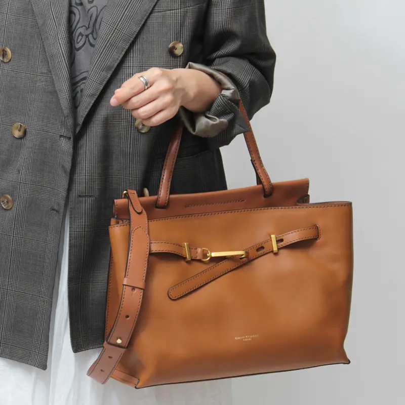 バッグをエレガントに包み込むベルトディテールに、ブランドオリジナルのスナップフックがアクセント効かすのトップハンドルバッグ。イタリアブランドならではの洗練されたデザインは、シンプルな装いにも上質感をプラスしてくれ、忙しい日常にもスマートに対応。都会的で上品なカジュアルスタイルを完成させる、ジャンニ キアリーニの魅力が詰まったバッグです。