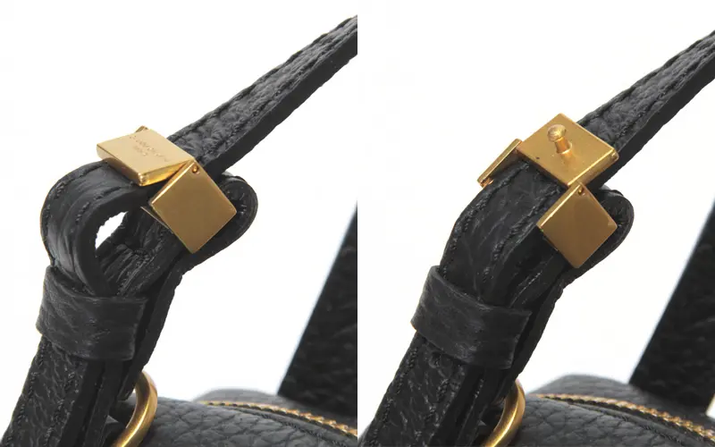 レザーハンドルは、ギボシ留めで長さ調節が可能。金具がしっかりと固定されており、指では押し上げにくい仕様です。調整の際は、ストラップをたゆませてからベルト部分を上に引くことで、スムーズに長さを変えることができます。
