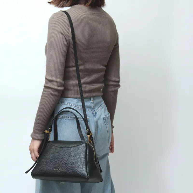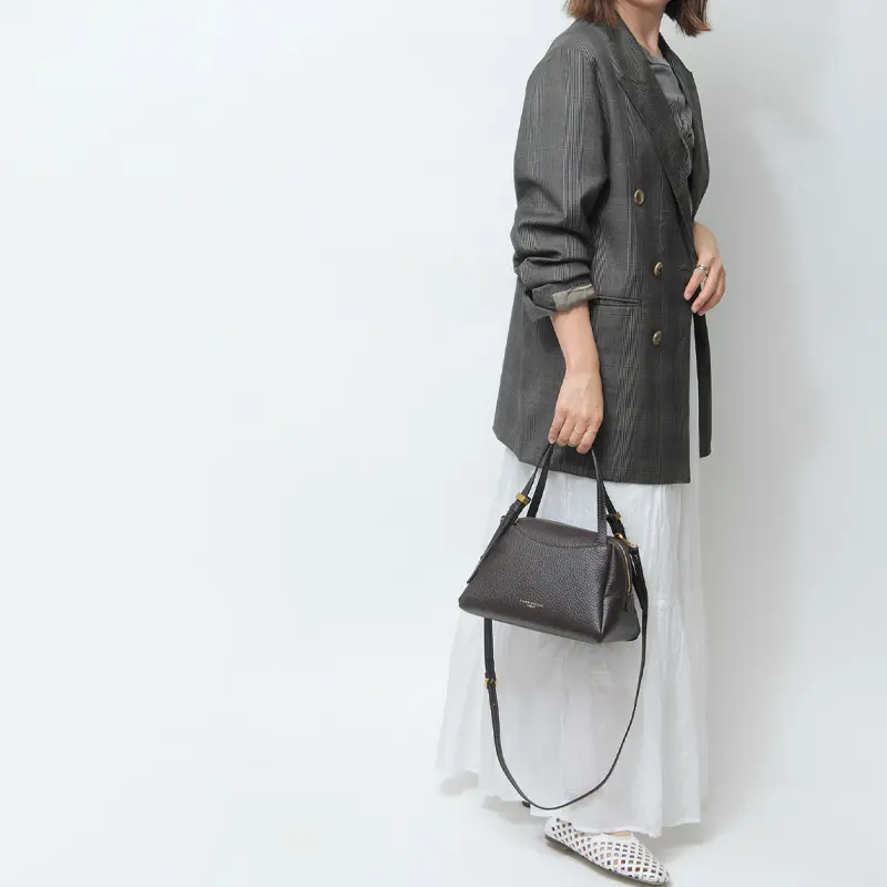 女性らしさを引き立てる華奢なレザーのハンドルは、平手デザインで手に優しくフィット。手持ちはもちろん、手首に通しても程よい長さで、使いやすい設計。