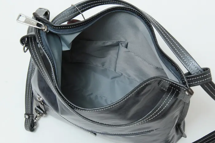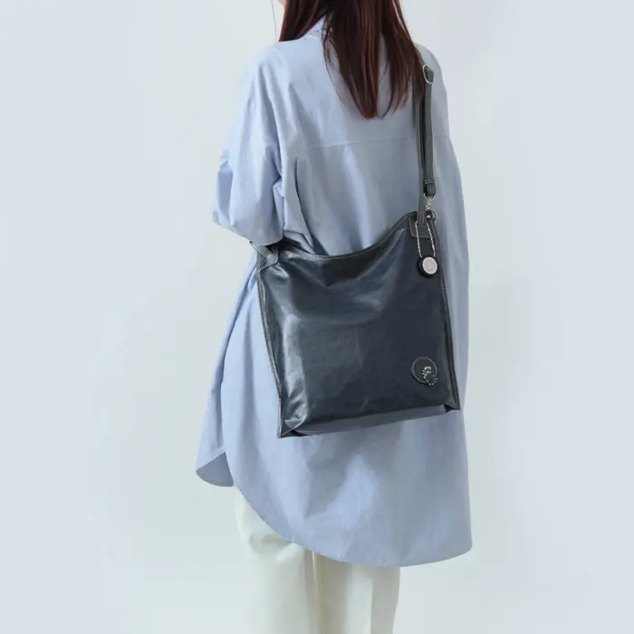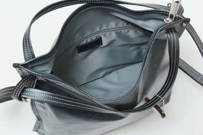 開閉は防犯面も安心のファスナー仕様です。ショルダーだとA4サイズが縦にぴったり収まる大きさです。長財布やポーチなど必需品に加え、ペットボトルや折り畳み傘も収まる収納量です。内ポケット付きなので小物も整理して収納できます。