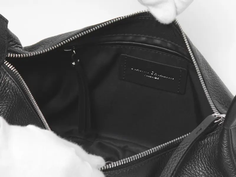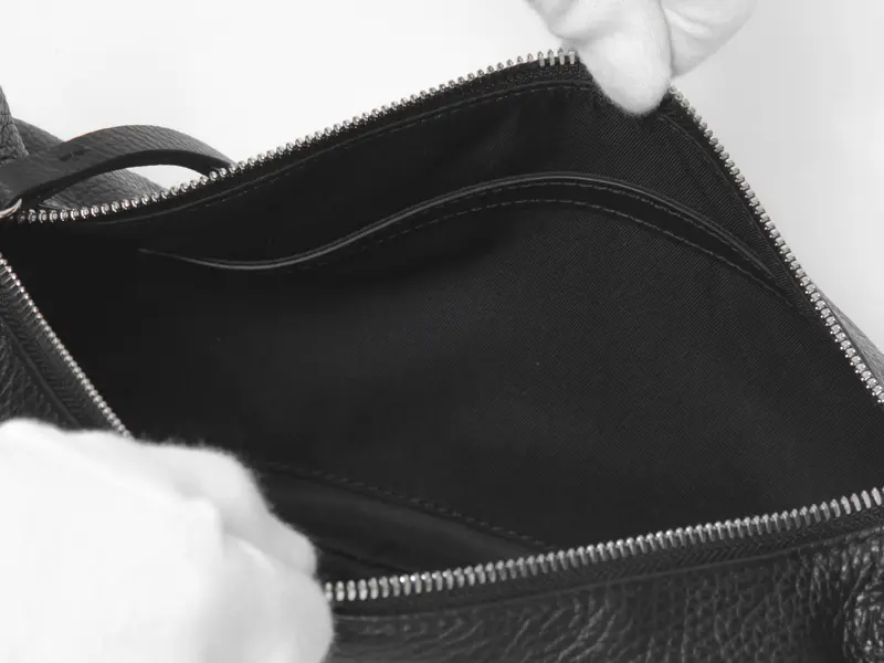 開閉はファスナー仕様。マチのある立体構造により、見た目以上の収納力を実現。長財布や500mlのペットボトルもすっきり収まる、頼もしいサイズ感です。