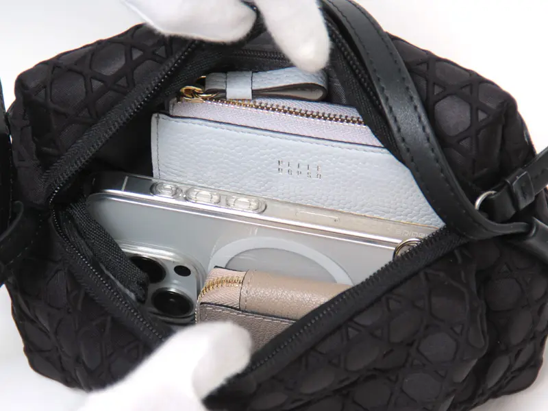 開閉はファスナー仕様。ミニ財布やスマホなどの必需品がコンパクトに収まるサイズ感です。これ一つでお出かけが可能なので、身軽にお出かけをお楽しみいただけます。