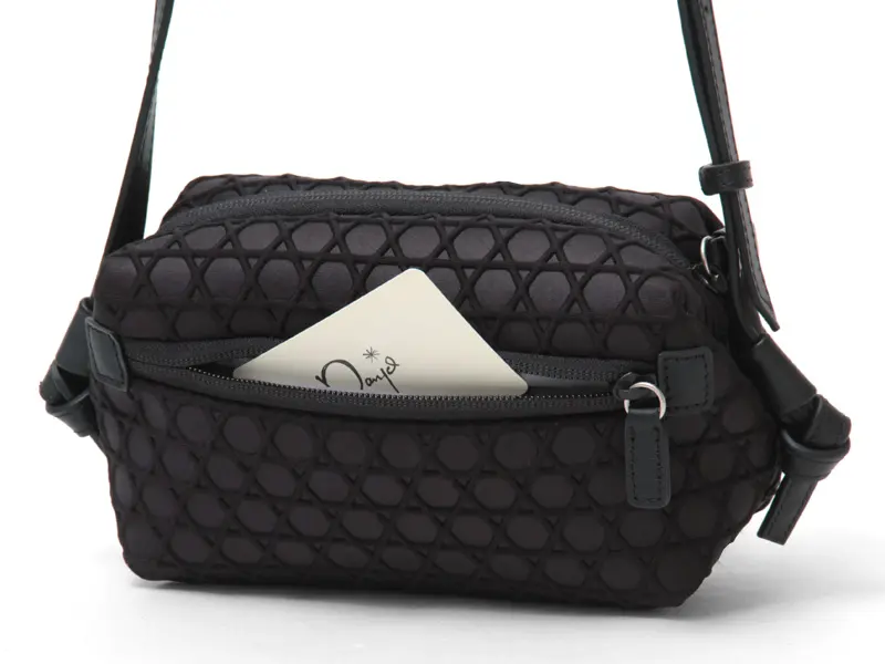 軽くて丈夫なポリウレタン素材にカゴメ柄を型押しした"LAQUOH /ラクーオ"の"篭目エンボスボンディング"シリーズ。手にした瞬間に驚く軽さと上質でなめらかな質感のショルダーバッグは、ミニマルな佇まいながら、しっかりとしたマチ幅があるため、スマートフォンやミニ財布も入る見た目以上の収納力。ショルダーベルトを短く調整すればボディバッグとしてもお使いいただけます。また撥水加工を施しているため、急な雨でも安心です。