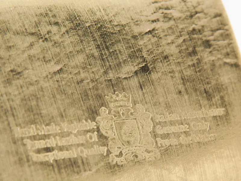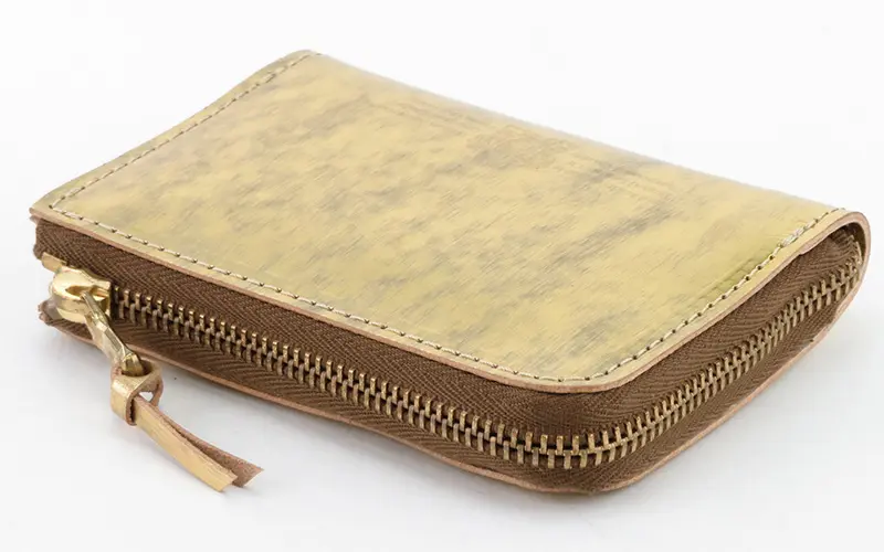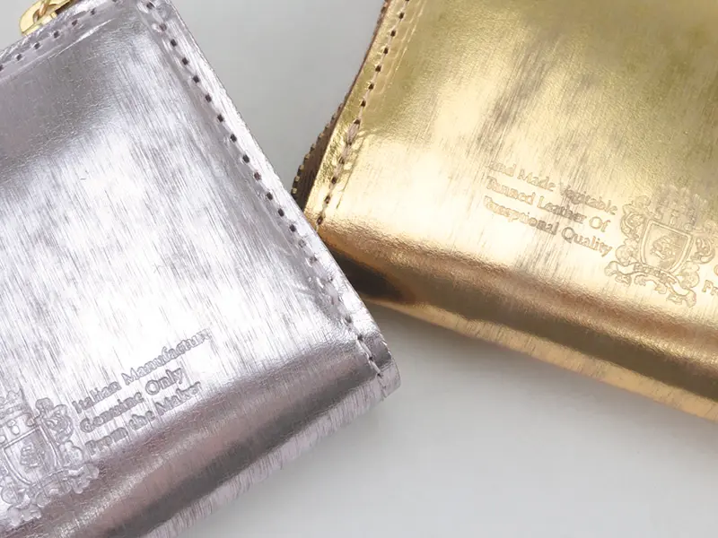 上質なヌメ革の表面に箔を施し、さらに手作業で丁寧にやすりをかけることで、独特の光沢感とムラのある豊かな表情を生み出しています。使い込むほどに箔が徐々に取れ、下地のヌメ革が浮かび上がることで、経年変化ならではの奥深い風合いを楽しめる特別なレザーです。