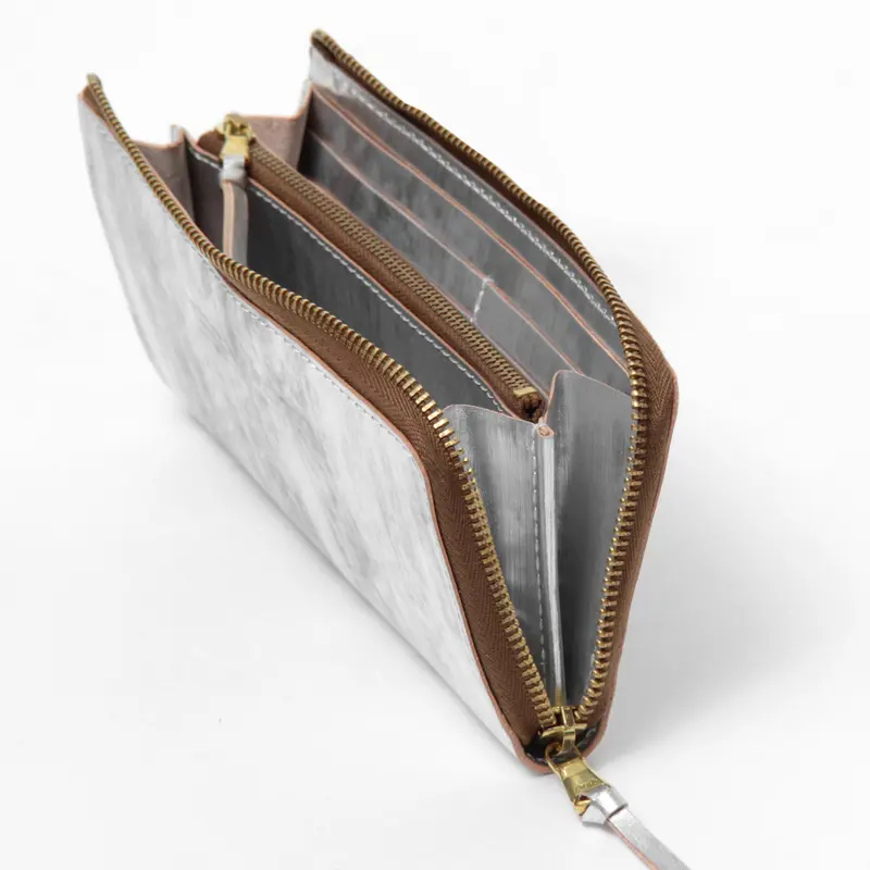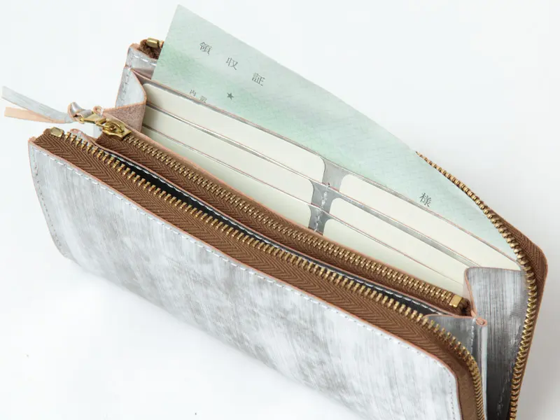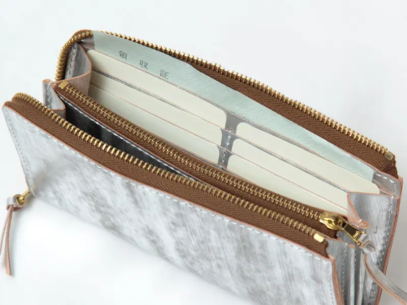 すっきりと閉じられるL字ファスナー仕様。無駄のないシンプルなフォルムは、バッグの中でもかさばらず、スマートに持ち運べます。