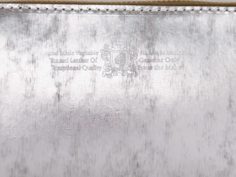 上質なヌメ革の表面に箔を施し、さらに手作業で丁寧にやすりをかけることで、独特の光沢感とムラのある豊かな表情を生み出しています。使い込むほどに箔が徐々に取れ、下地のヌメ革が浮かび上がることで、経年変化ならではの奥深い風合いを楽しめる特別なレザーです。