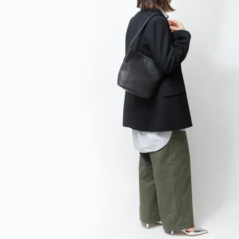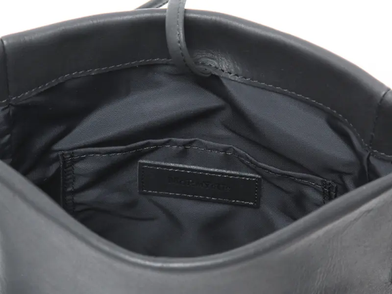 開閉はサッと開けられて荷物の出し入れがしやすいリボン仕様。柔らかくしなやかな牛革で、開口部がとても大きく開きます。肩にかけたまま中身も確認でき、必要なものをさっと取り出せます。