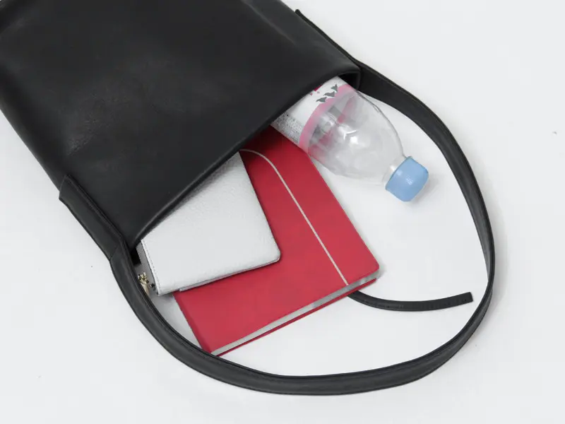 長長財布などの必需品に加えて、A5サイズの手帳が収まり、ペットボトルや折り畳み傘が縦向きに収まります。