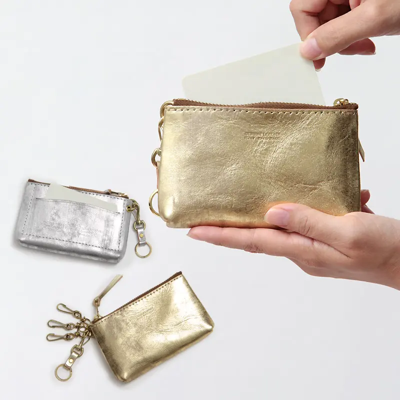 華やかな輝きを放つ “saranam サラナン”「Foil(フォイル)」シリーズのキーポーチ。メタリックな箔加工を施した牛革は、光の角度で表情を変え、手元をエレガントに彩ります。女性の手に収まるコンパクトなサイズながら、鍵やスマートキー、カード類をひとまとめに収納可能。フック付きでスマホショルダーやバッグにセットするのもお薦めです。小物のカラーを揃えれば、洗練されたコーディネートが完成します。
