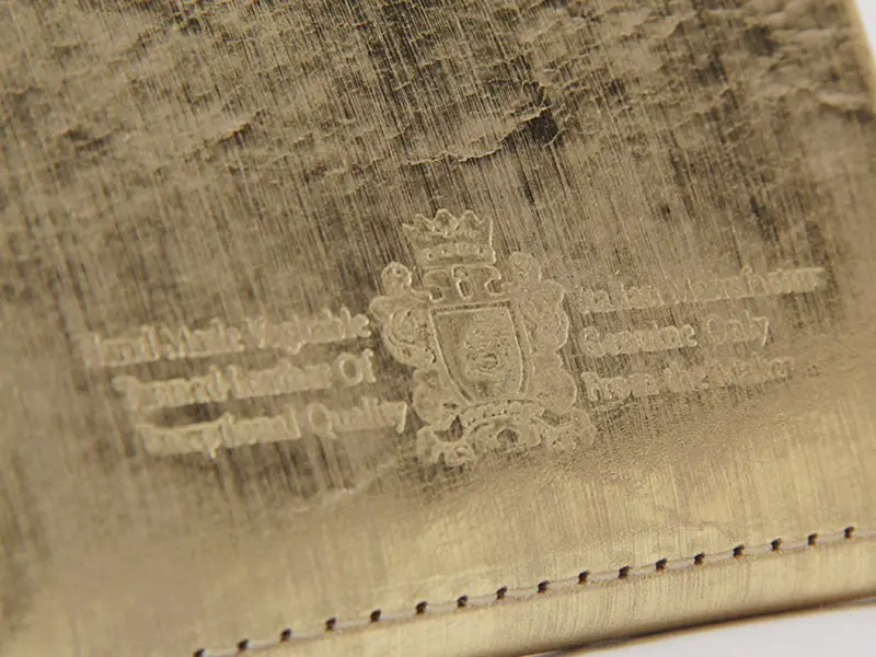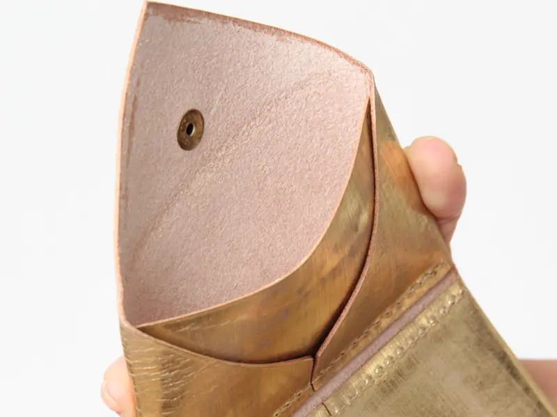 上質なヌメ革の表面に箔を施し、さらに手作業で丁寧にやすりをかけることで、独特の光沢感とムラのある豊かな表情を生み出しています。使い込むほどに箔が徐々に取れ、下地のヌメ革が浮かび上がることで、経年変化ならではの奥深い風合いを楽しめる特別なレザーです。