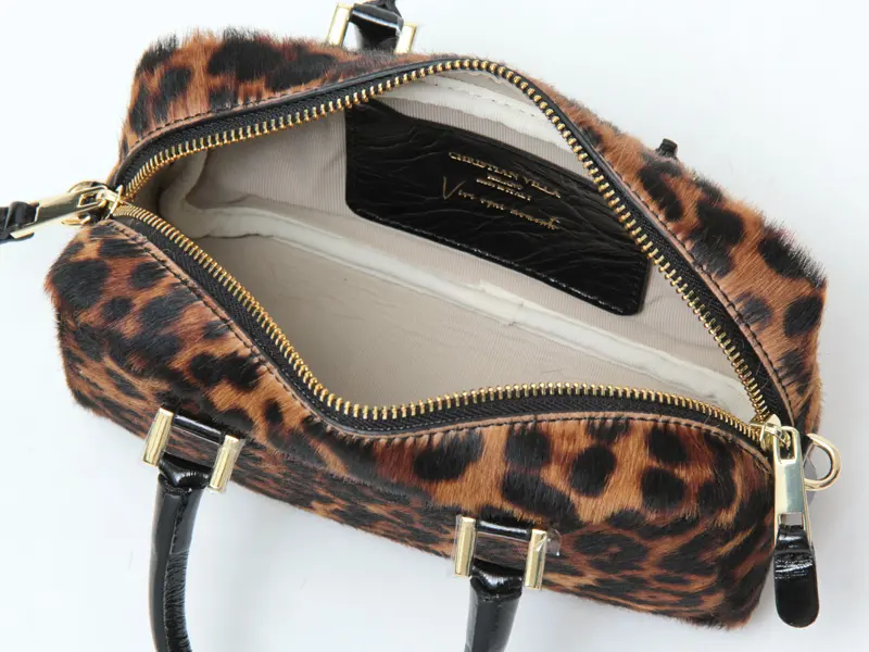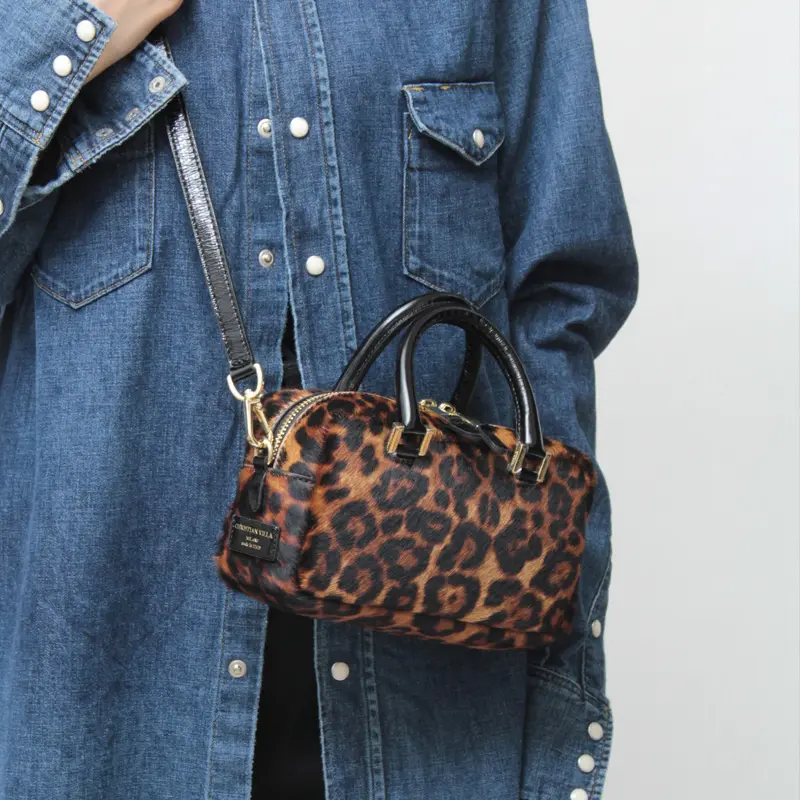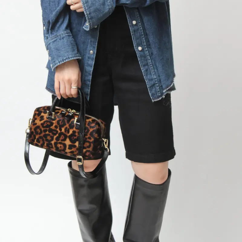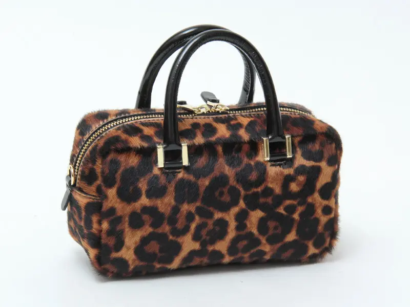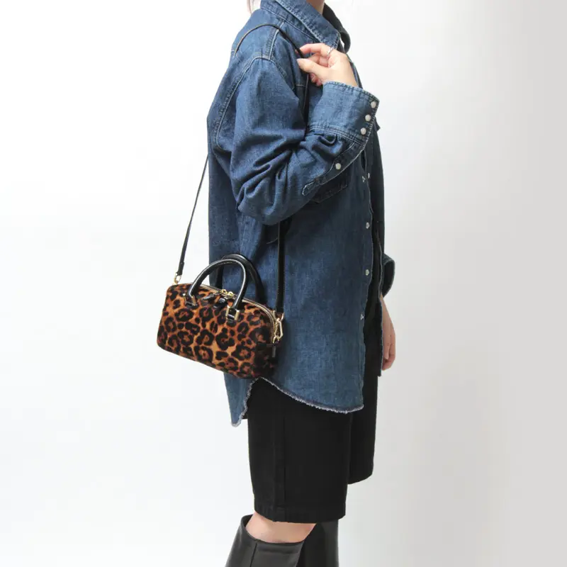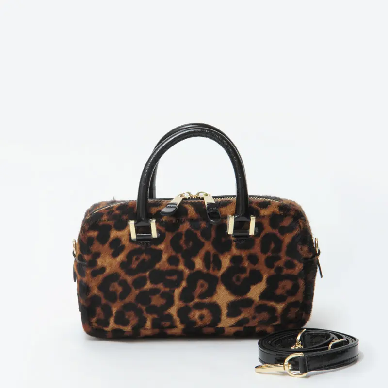 滑らかな手触りのヘアカーフに、秋冬らしいヒョウ柄を施しています。レザーにはエナメルを使用。個性的でありながら落ち着いた雰囲気を持ち、上品さと遊び心を両立した大人に似合うレオパードバッグです。