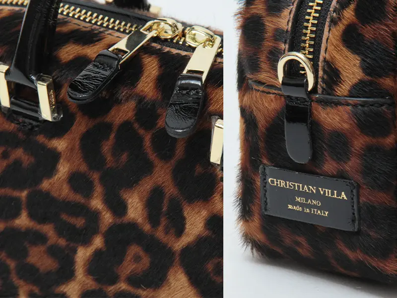 レオパード柄が目を惹くChristian Villa(クリスチャンヴィラ)のミニボストンバッグ。ヘアカーフを使用し、シーズンムード漂わせます。横型シルエットでトレンド感があり、ミニサイズなのでアクセサリー感覚でコーデを華やかに彩ります。ハンドでもクロスボディでも持てる2way仕様で、スタイリングにこなれ感をプラスするイタリア製バッグです。
