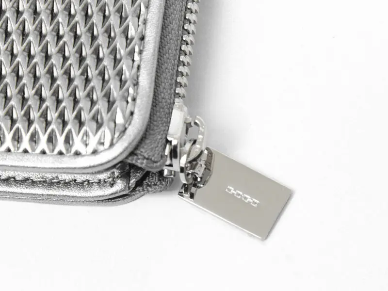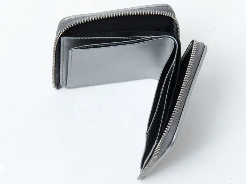 開閉部にはコの字ファスナーを採用。ファスナーを一度開くだけでカード・小銭・お札のすべてを取り出せるスマートな設計です。大きく開くことで中身がひと目でわかり、出し入れもスムーズ。