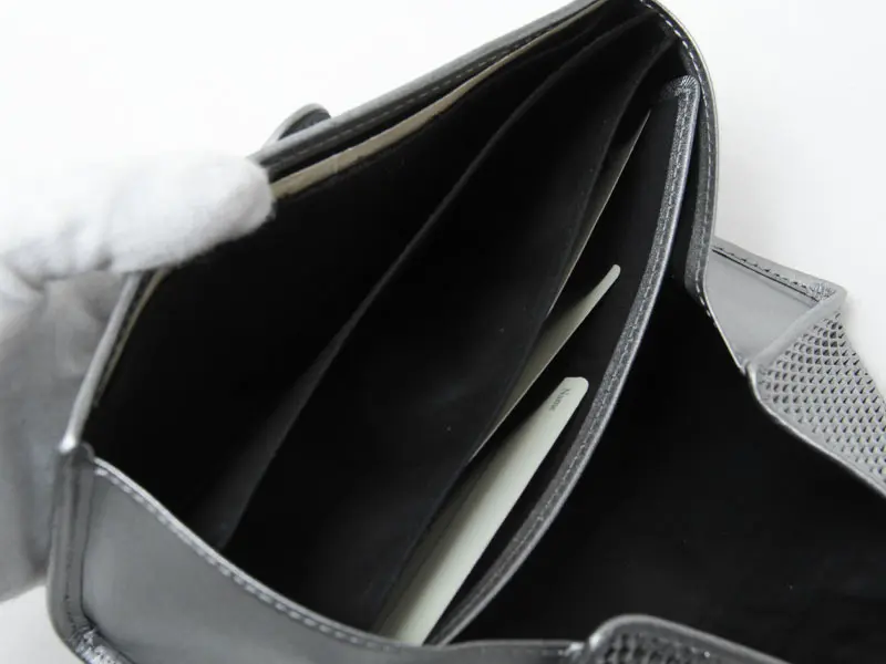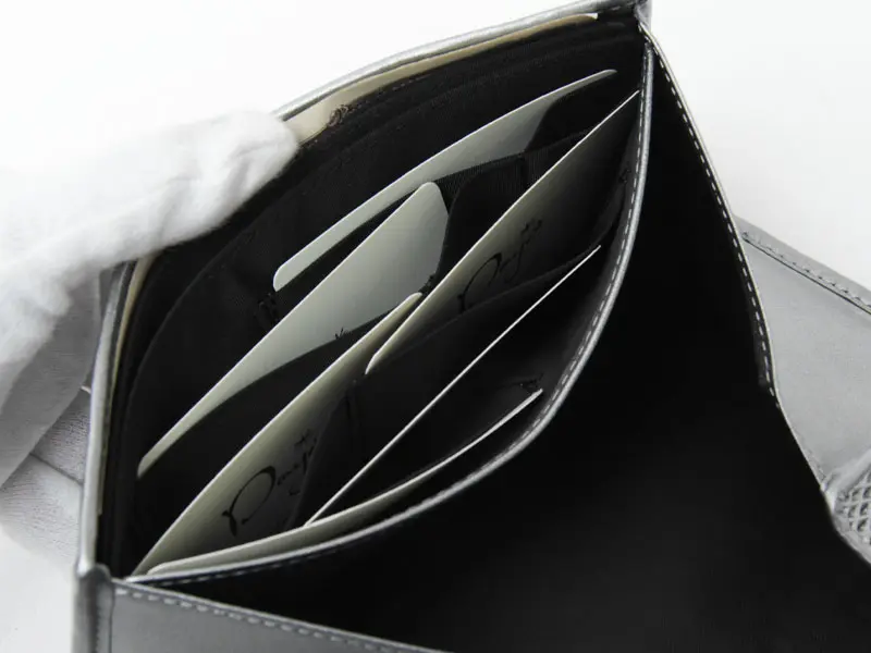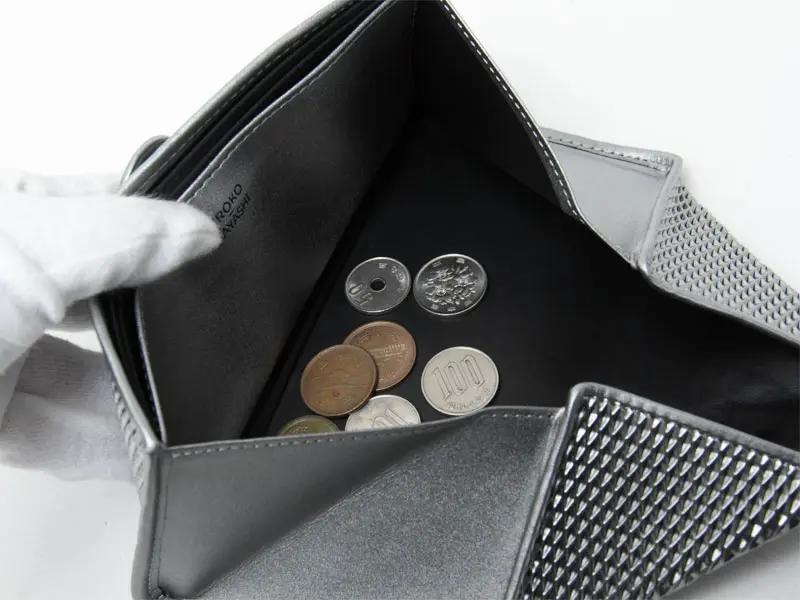 小銭入れと同じ向きでカードや紙幣を取り出せるため、支払いもスムーズに。所作を美しく見せてくれます。 見やすく取り出しやすい互い違いのカード収納は6ヶ所あり、1ヶ所に2~3枚収まるので約15枚収納可能。さらにお札入れは3ヶ所に分かれており、レシートや領収書もすっきり整理できます