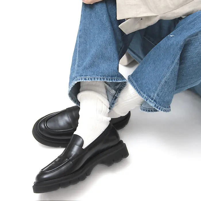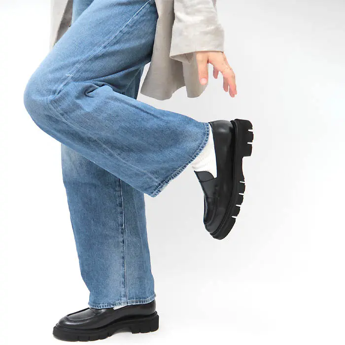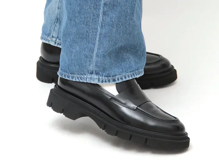 アッパーは王道のローファーデザイン。ハンサムにパンツスタイルにはもちろん、スカートなどきれいめスタイルの外しアイテムにもおすすめです。サイドにスリットが入っているので、足入れもスムーズ。履き込みが深く安定感抜群です。