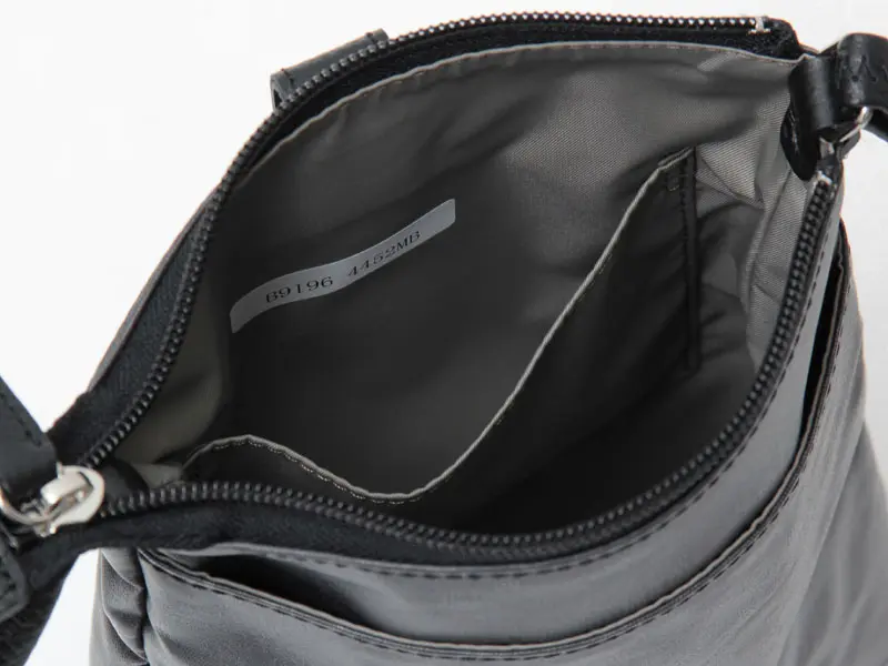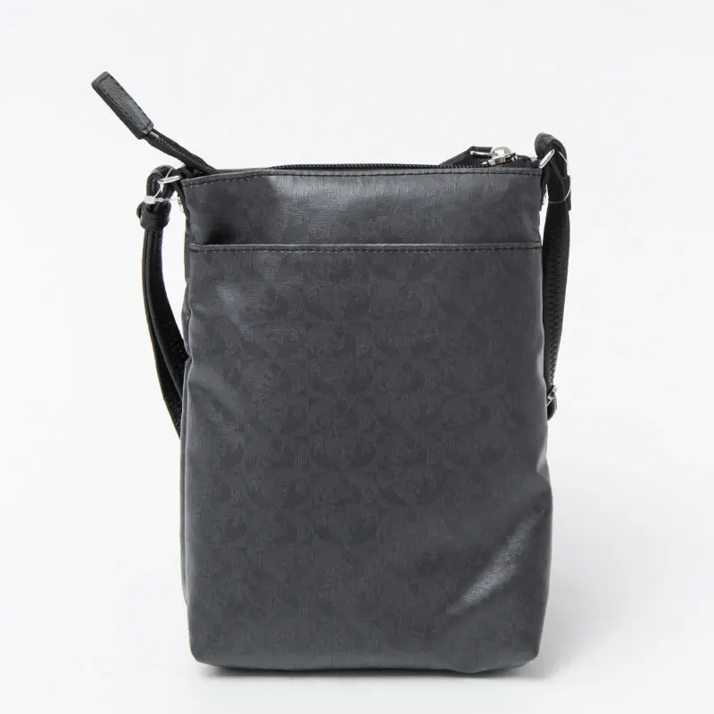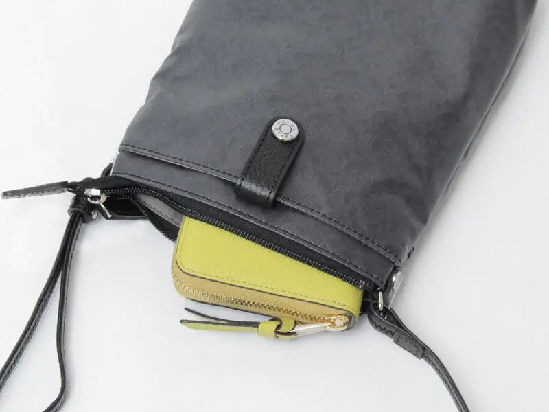 メインの開閉はファスナー仕様で、長財布などお出かけに必要なものがしっかり入ります。背面内側にも収納ポケットがあり、細かい小物の収納に便利です。