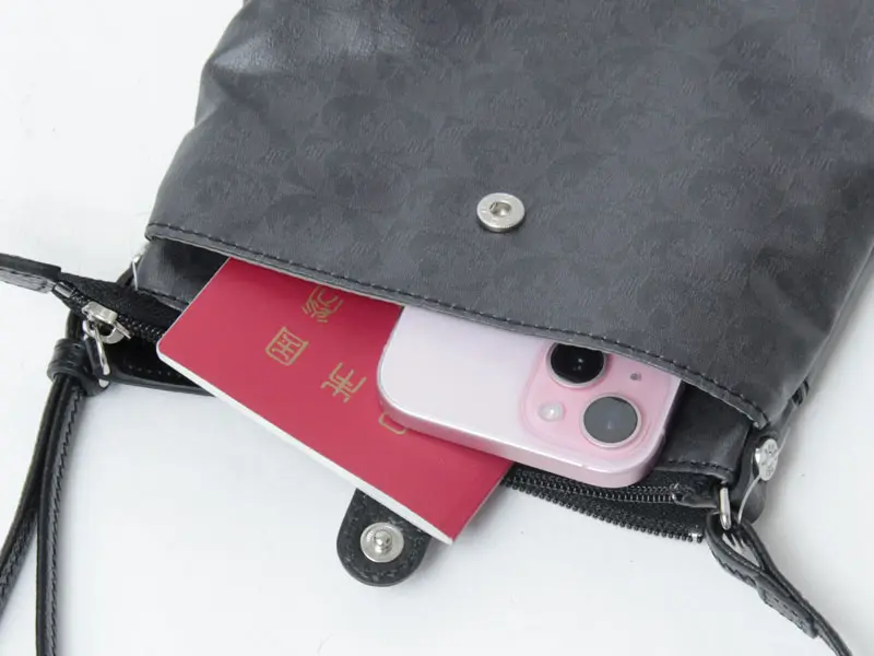 正面にはスナップボタン式のオープンポケットが備わっており、パスポートやスマホなどすぐ取り出したいものを収納しておくのに便利です。