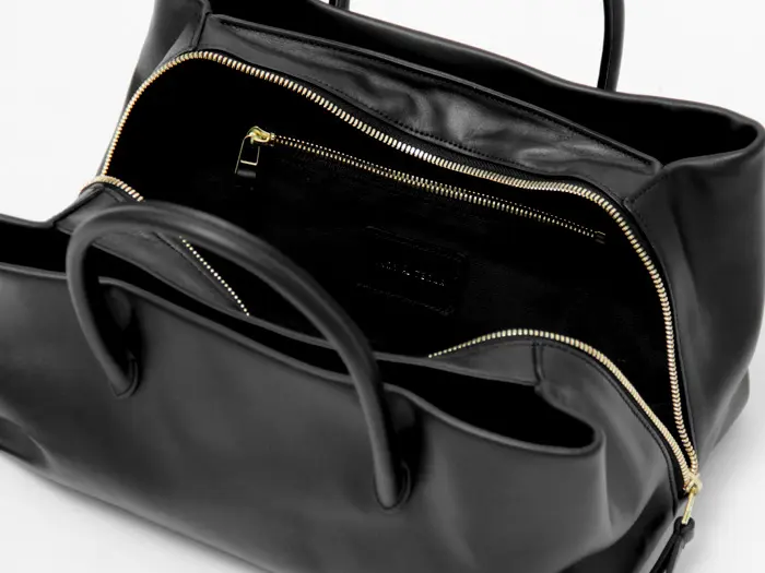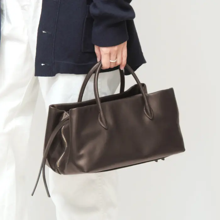 程よいハリとコシのある柔らかなイタリア製のソフト牛革を使用。フォーマルでもカジュアルでも使えるシンプルな本革のバッグは1つは持っておきたいアイテムです。 時間の経過と共に表情が変わってゆく経年変化も楽しめます。