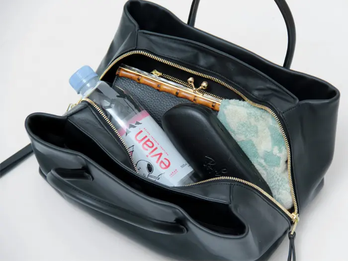 長財布やポーチなど必需品が収まり500mlのペットボトルも横向きに収納でき、お出かけにちょうどいい収納量です。背面の内側には大きめのファスナーポケットが1つ付いており、貴重品などの収納に便利です。
