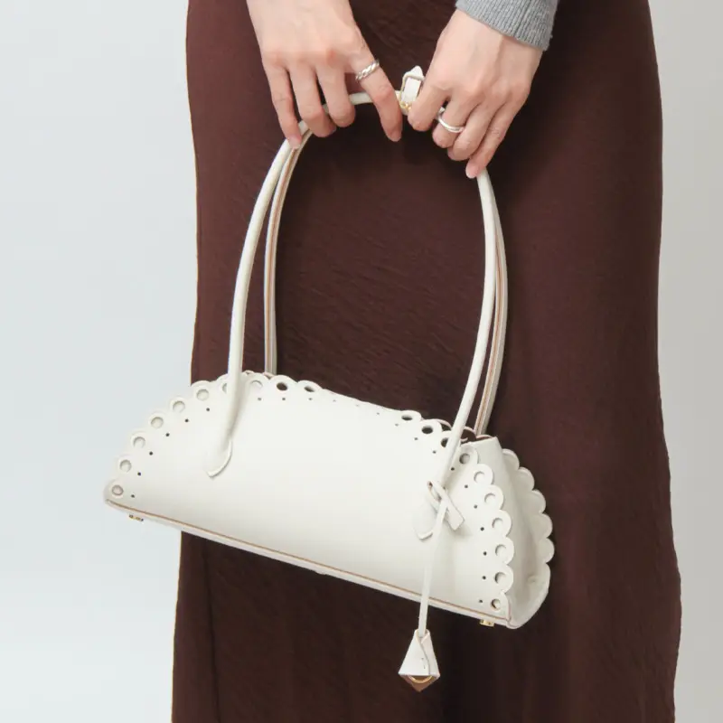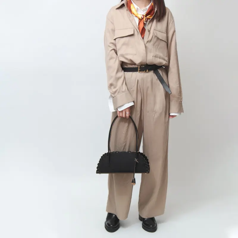 印象的な長めのハンドル。さっと手持ちでこなれた印象に。肩がけも可能で、両手を自由に使えるため、お出かけやショッピングも快適です。ハンドルを固定できるベルトループが付いています。