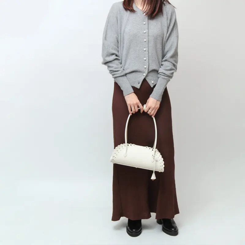 収納は長財布やポーチなどの必需品がしっかり収まるサイズ感で、デイリーからお出かけまで活躍します。内側にはスムースタイプの人工皮革を使用しており、水拭きできるため扱いやすさも魅力です。
