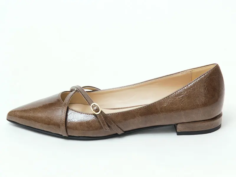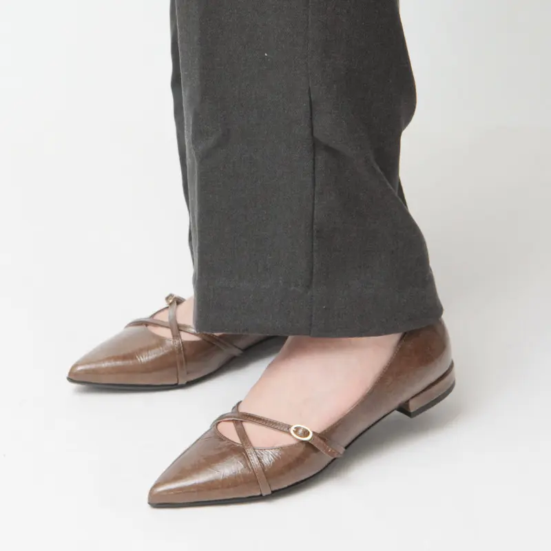 つま先のポインテッドトゥが美しいラインを描き、アッパーのクロスベルトがさりげなく足元を引き締めます。履くだけでコーデに洗練されたムードをプラスする一足です。