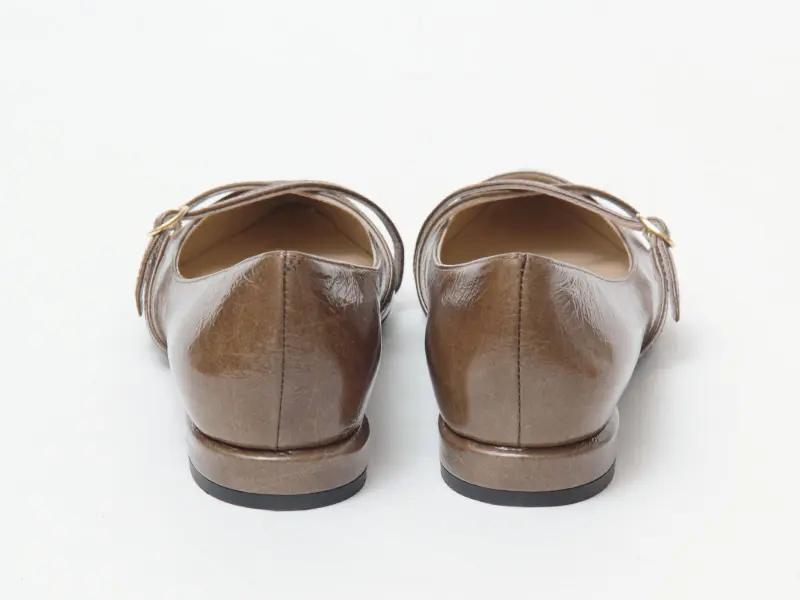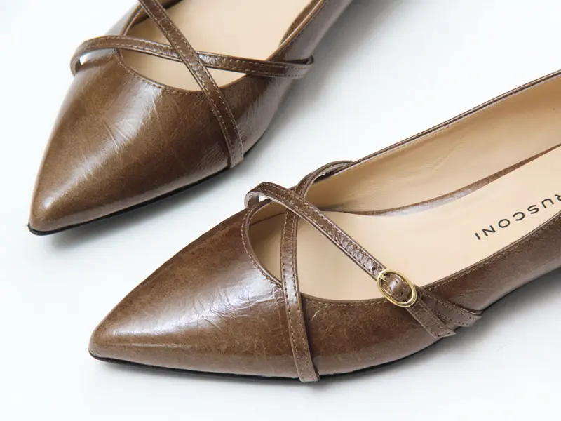 アッパーのクロスベルトが立体的な表情を作り、ポインテッドトゥがシャープな印象を演出。光沢のあるレザーはわずかにシワ感があり、上品で柔らかな質感をプラスします。